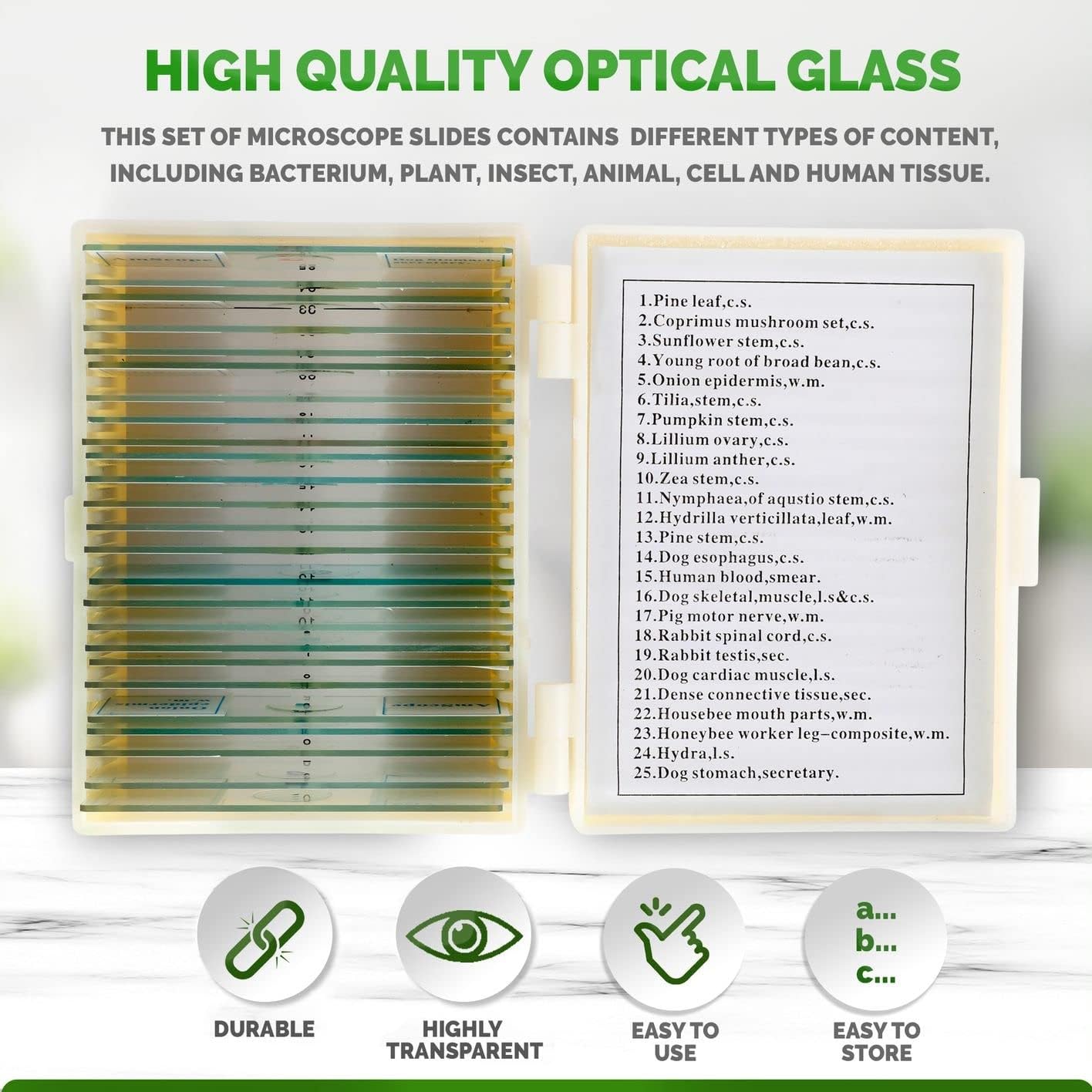 AmScope 25pc Prepared Glass Microscope Slides in Plastic Case with Plant, Fungus, Insect and Mammal Specimens