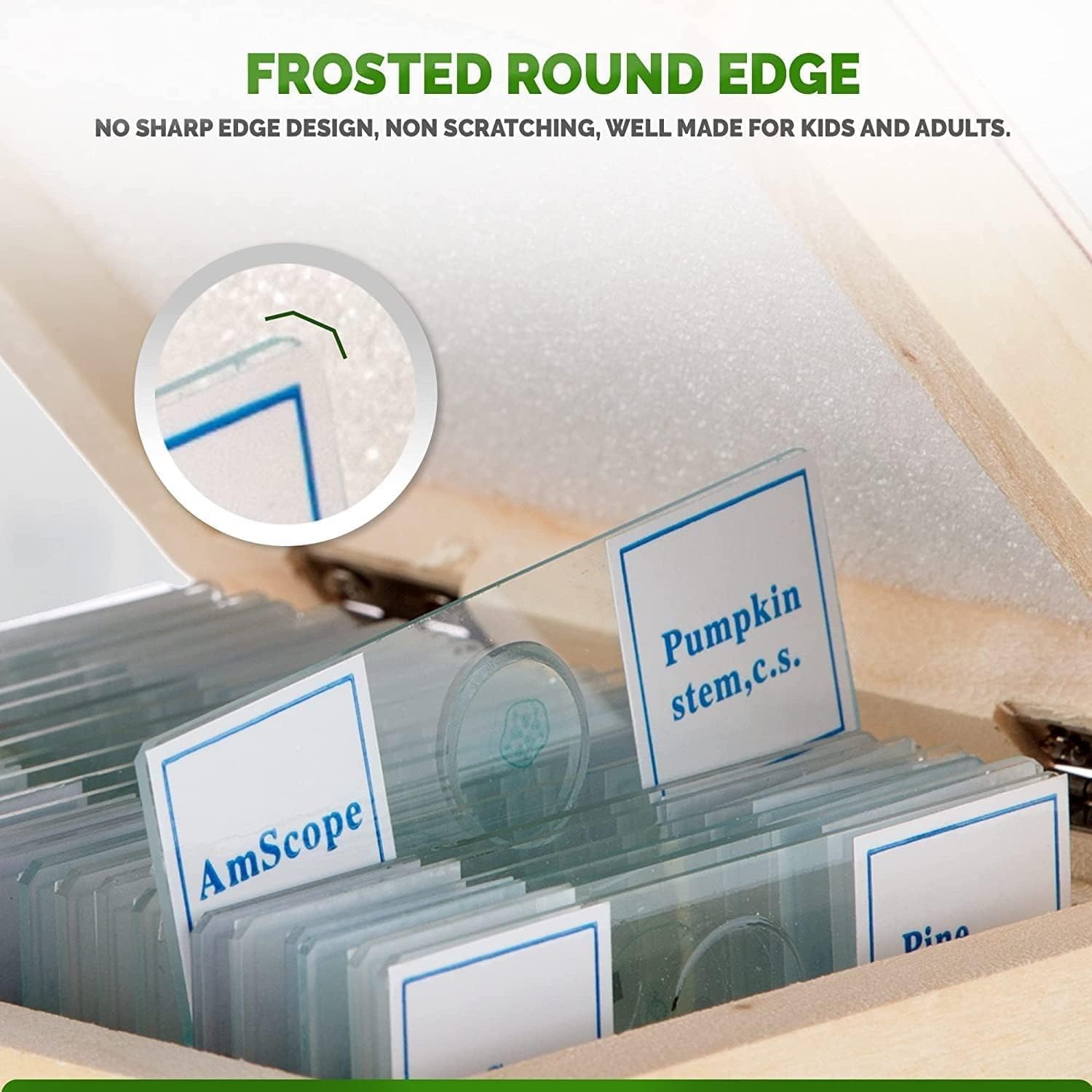 - Slides are composed of optical glass for clear viewing