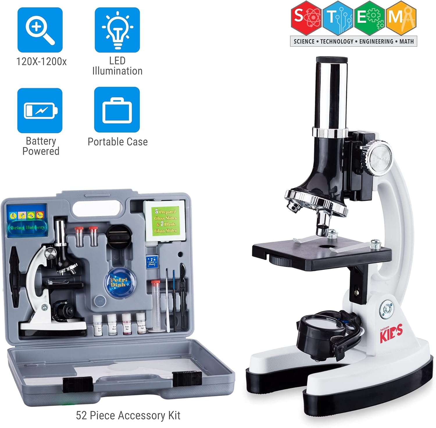 AmScope 120X-1200X 52-pcs Beginner Microscope STEM Kit with Metal Body Microscope, Plastic Slides, LED Light and Carrying Box (M30-ABS-KT2-W),White