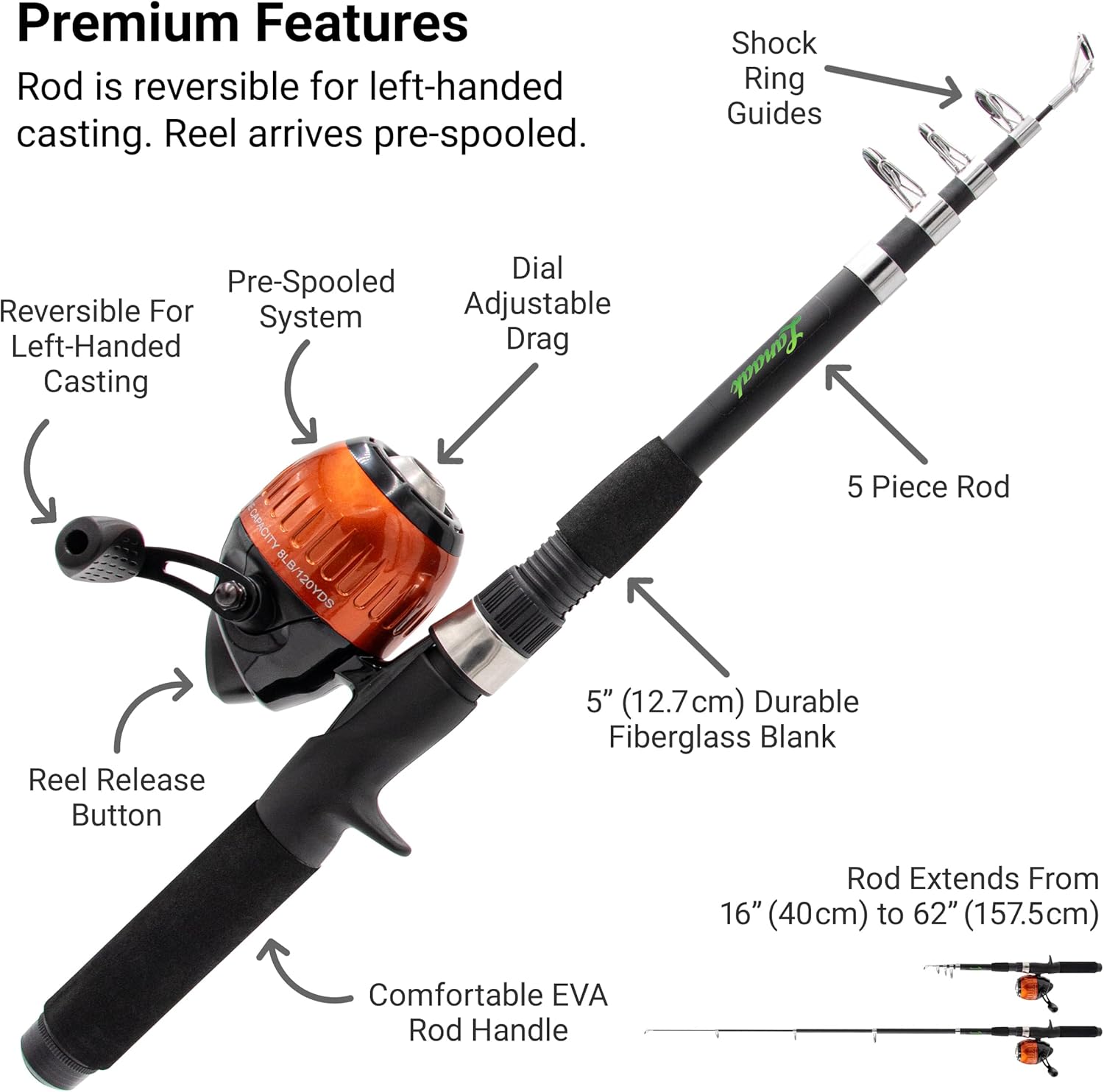 - STARTER FISHING GEAR KIT includes: 65 inch black rod telescopic fishing rod, spinning reel, minnow net, beginner’s guide, fishing lures, carry case and tackle box stocked with gear.