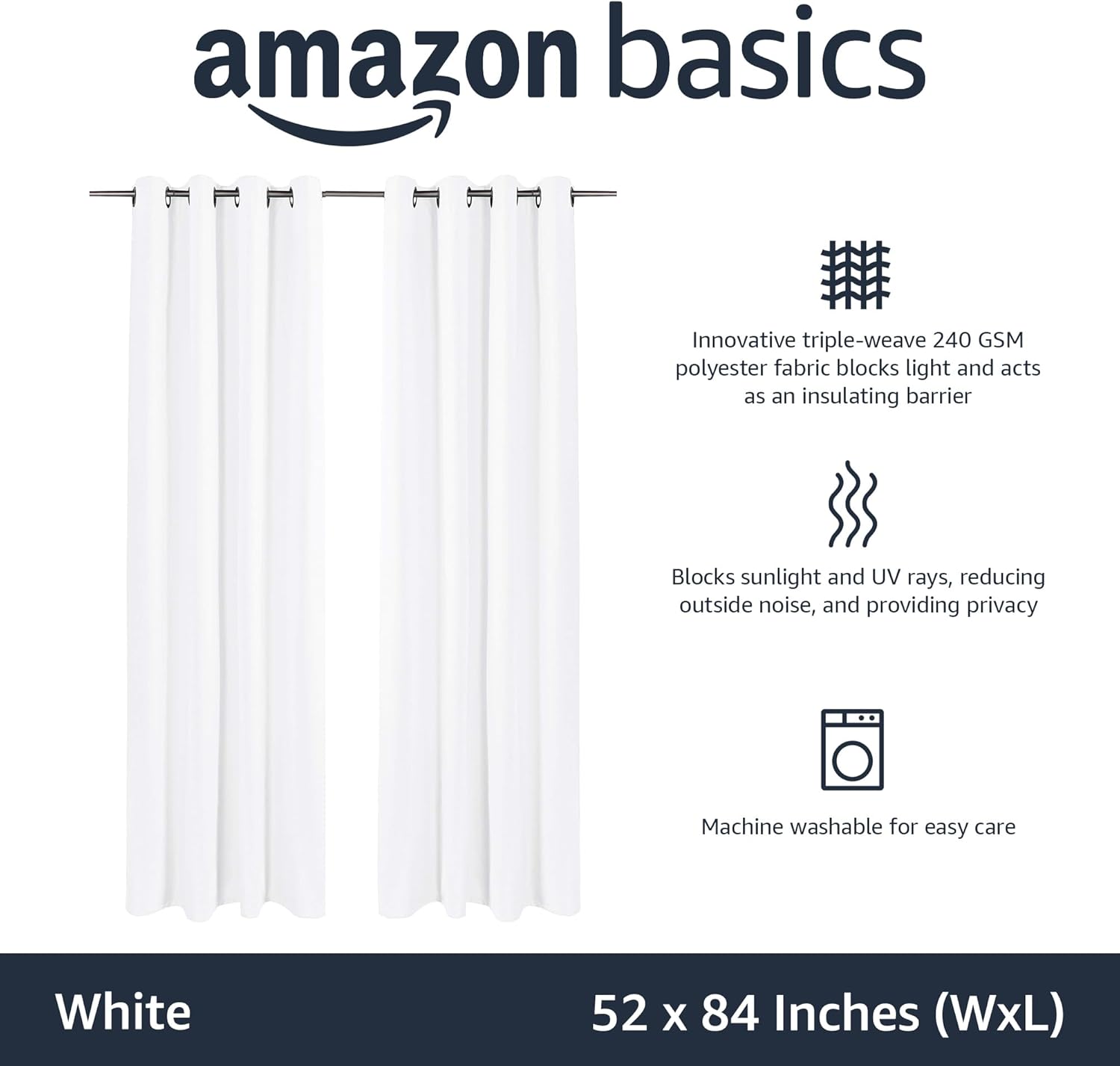 Amazon Basics Room Darkening Blackout Window Curtains 2 Panels with Grommets, for Living Room and Bedroom, 52 x 84 inches, White