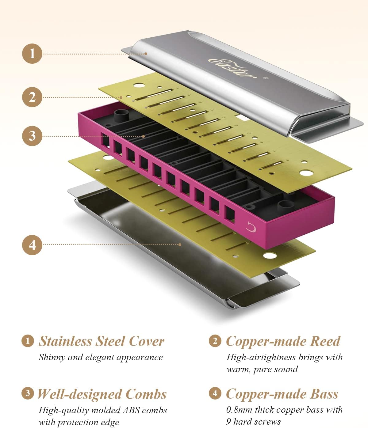 - ♬🎁 HIGH-QUALITY MATERIAL – Equipped with thickened brass base (1.0mm thick), this harmonica has stable resonance and reliable airtightness, with a pretty and durable silver cover plate. The non-toxic ABS combs are waterproof, high in hardness, and durable.