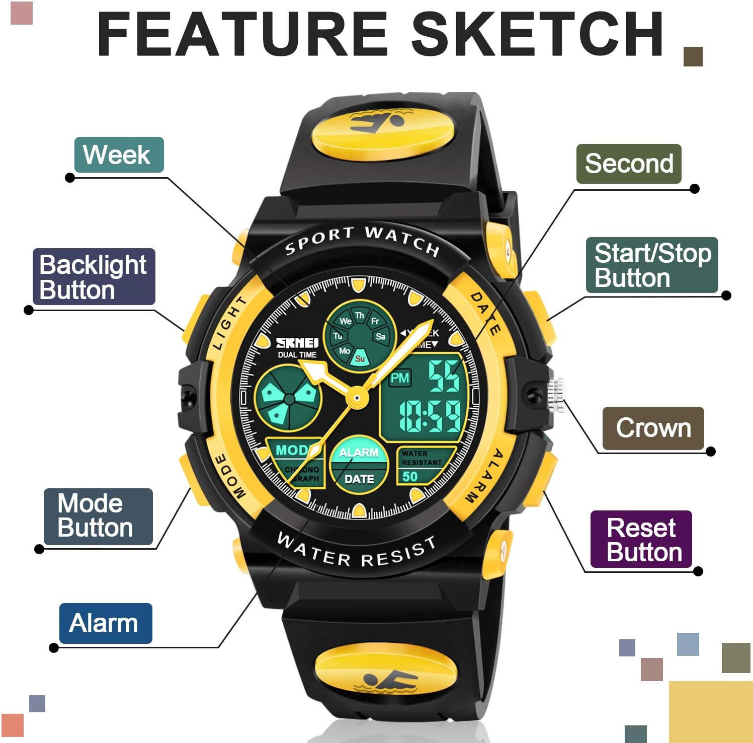 - ❤【MULTIFUNCTIONAL】Our Kids watch has various functions: Dual Time Display, Alarm Clock, Stop Watch, LED Luminous, Calendar Date Window, 50M Waterproof, Shock Resistant. Any child will like it.