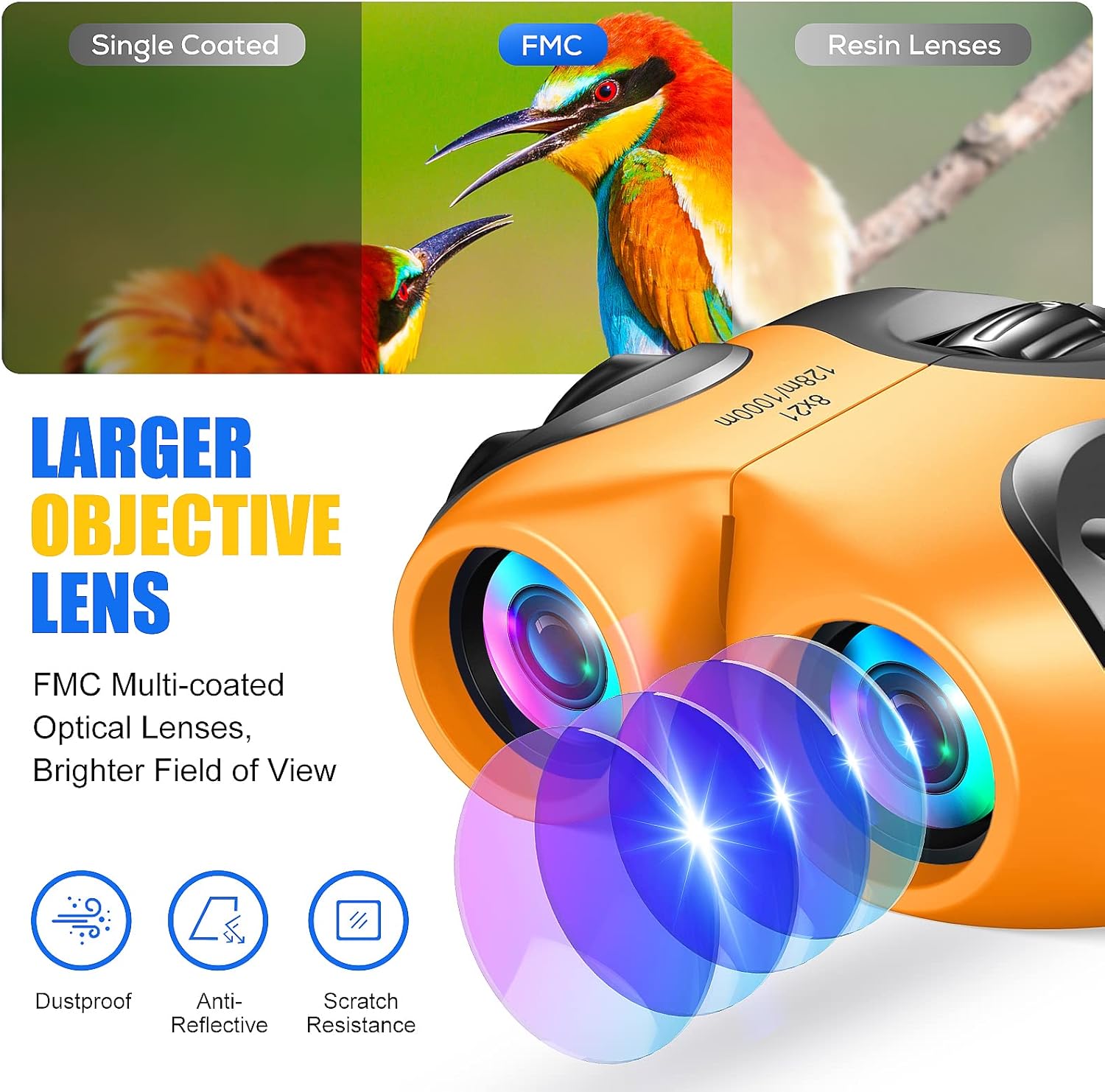 - ★Real binoculars for kids: this product has a superb Magnification of 8x with an amazing view. The binoculars can be adjusted to easily match the eye distance gap for each kids. Great for bird watching, hunting, hiking, traveling and enjoying the wilderness