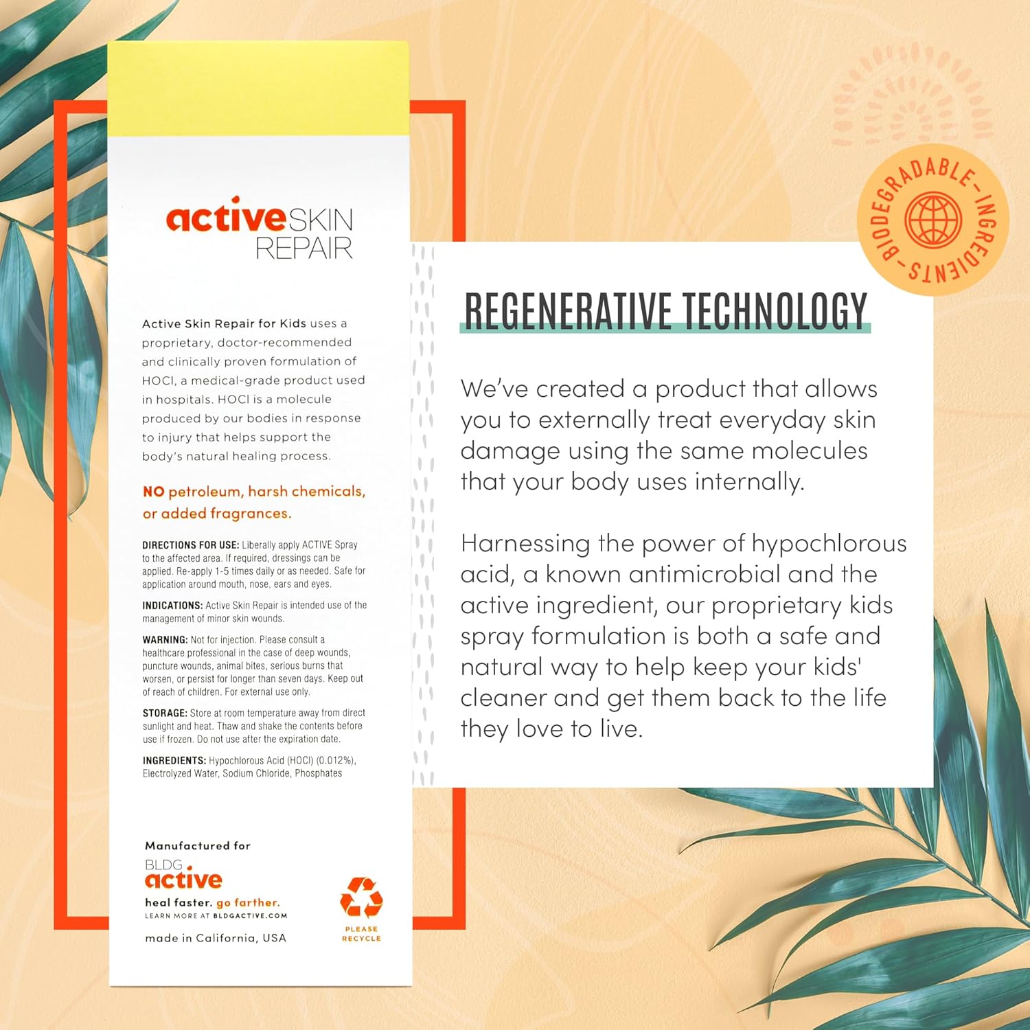 - FIRST AID MEDICAL GRADE HYPOCHLORUS ACID SPRAY FOR KIDS: The technology used in Active Skin Repair is the same safe and gentle molecule used in hospitals and households worldwide; Hypochlorus Acid cleanse wounds to help skin recover faster