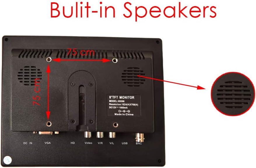 - 【Slim Design】This 8 inch LCD CCTV monitor comes with a very compact design with . With car cigarette lighter charger(DC 12-24V) for portable use. The housing made of ABS material with low temperature ductility and impact resistance. Support Vesa Hanging Holes 75x75mm.