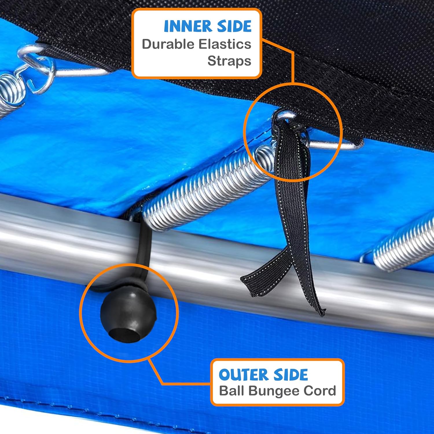 - Specification: Trampoline pad width: 8/10FT: 9.45 inch (24cm), 12FT: 8.66 inch (22cm), 14/15FT: 10.63inch (27cm). Anti-UV/Waterproof/Faded Resistance PE cover,thick EPE foam(16mm), PE bottom, ultra durable for years to use!