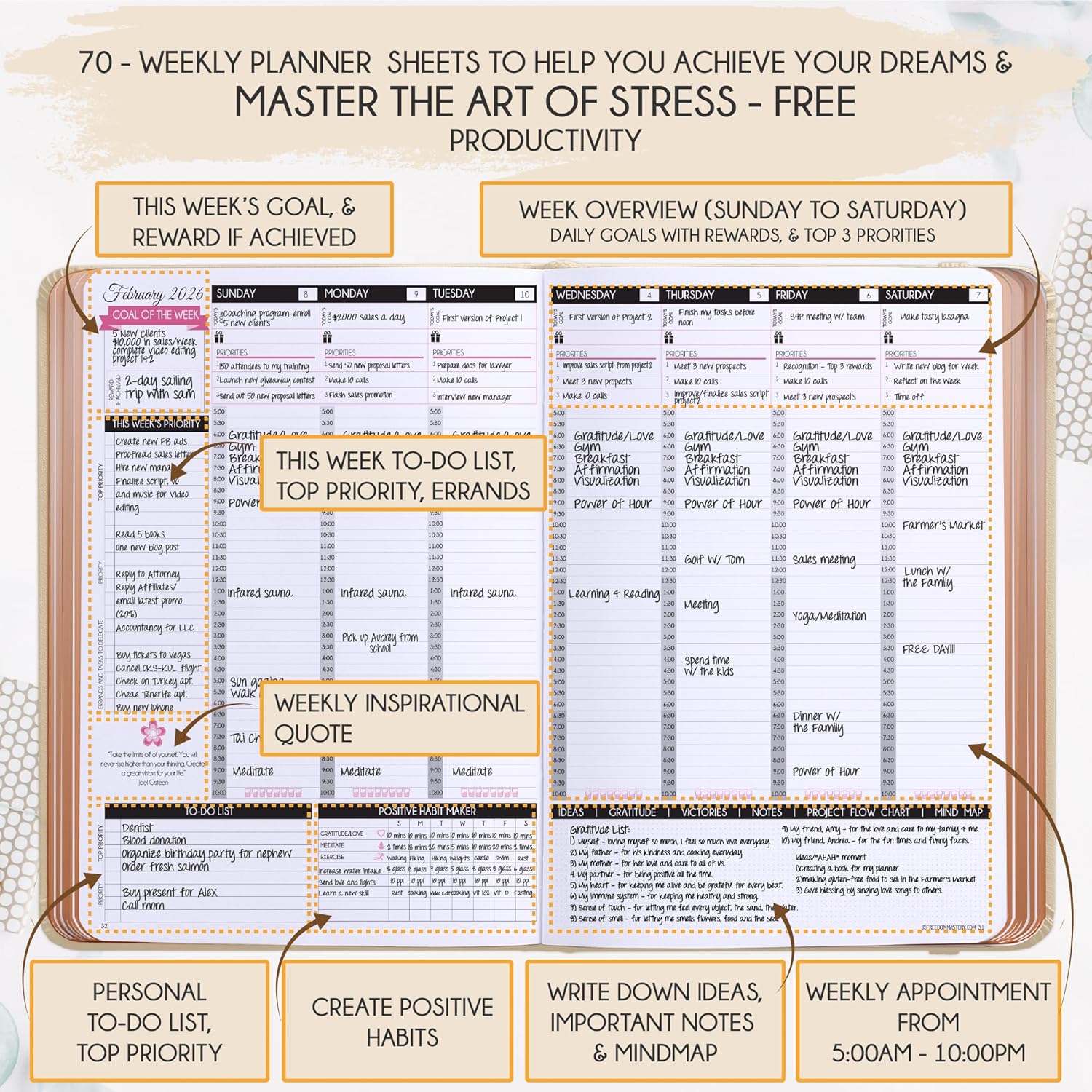 - WEEKLY PLANNER 2025-2026 - Increase your productivity and happiness. This is a deluxe life goal planner showing you how to become the best possible version of yourself on a mental, physical & interpersonal level using the law of attraction vibration guide. The weekly and monthly planner is also a daily, productivity, goal, business planner, to do list planner, notebook & gratitude journal all-in-one.