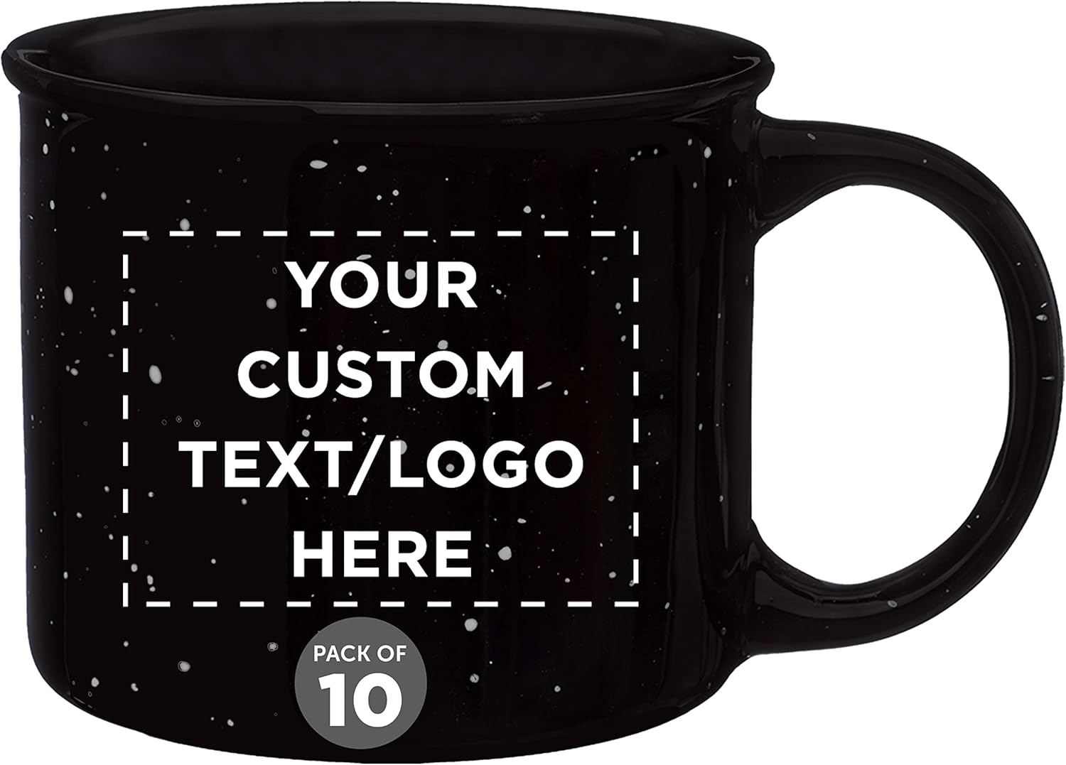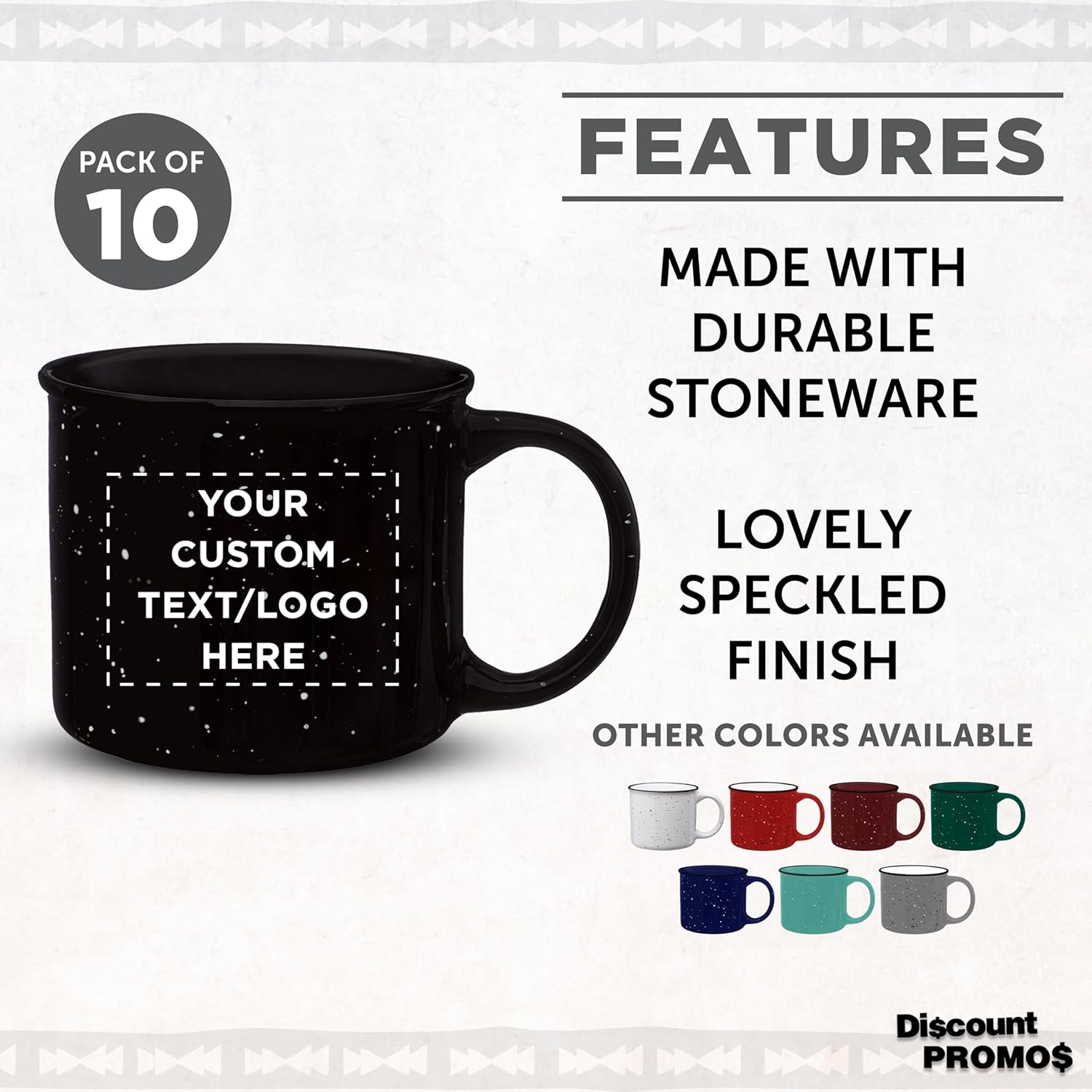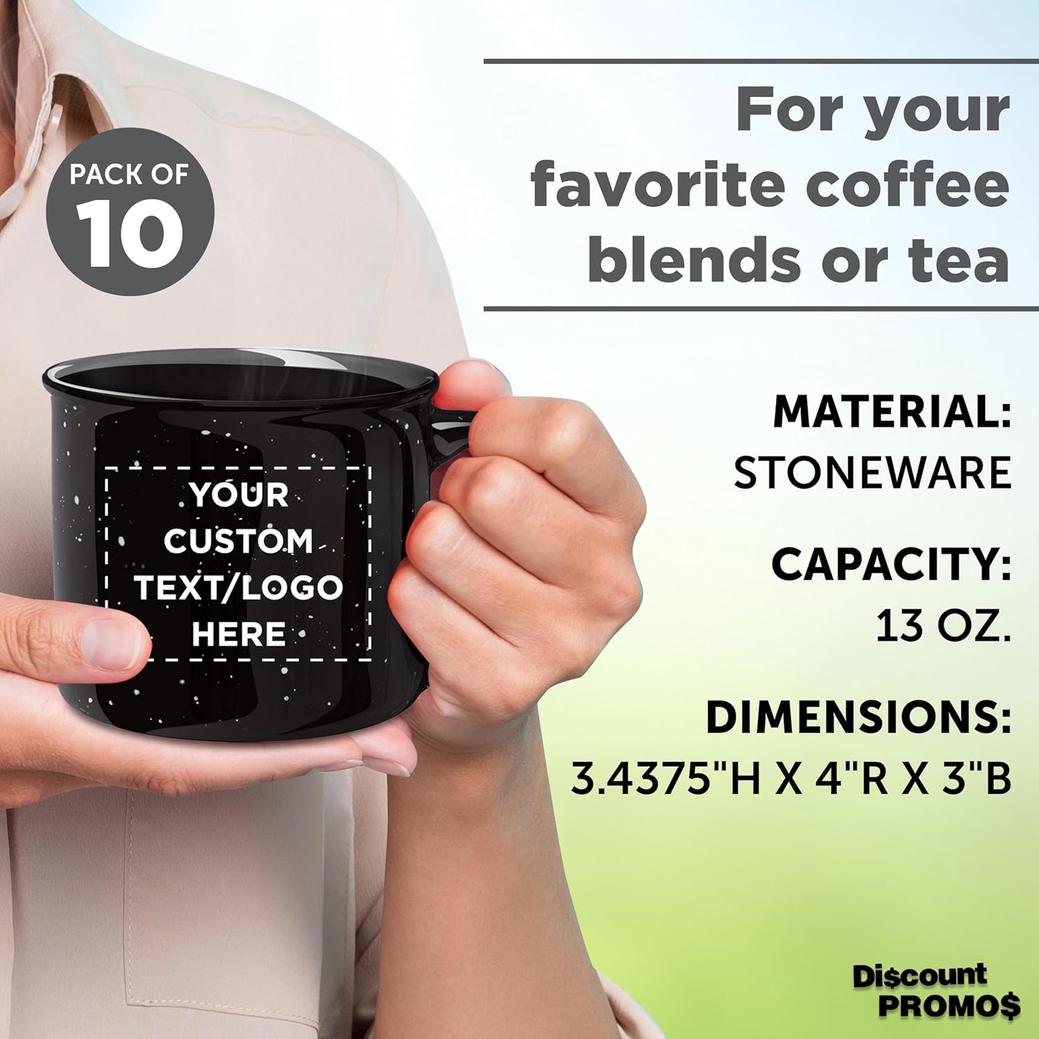 DISCOUNT PROMOS Custom Ceramic Campfire Coffee Mugs 13 oz. Set of 10, Personalized Bulk Pack - Perfect for Tea, Espresso, Cappuccino, Hot Cocoa - Black