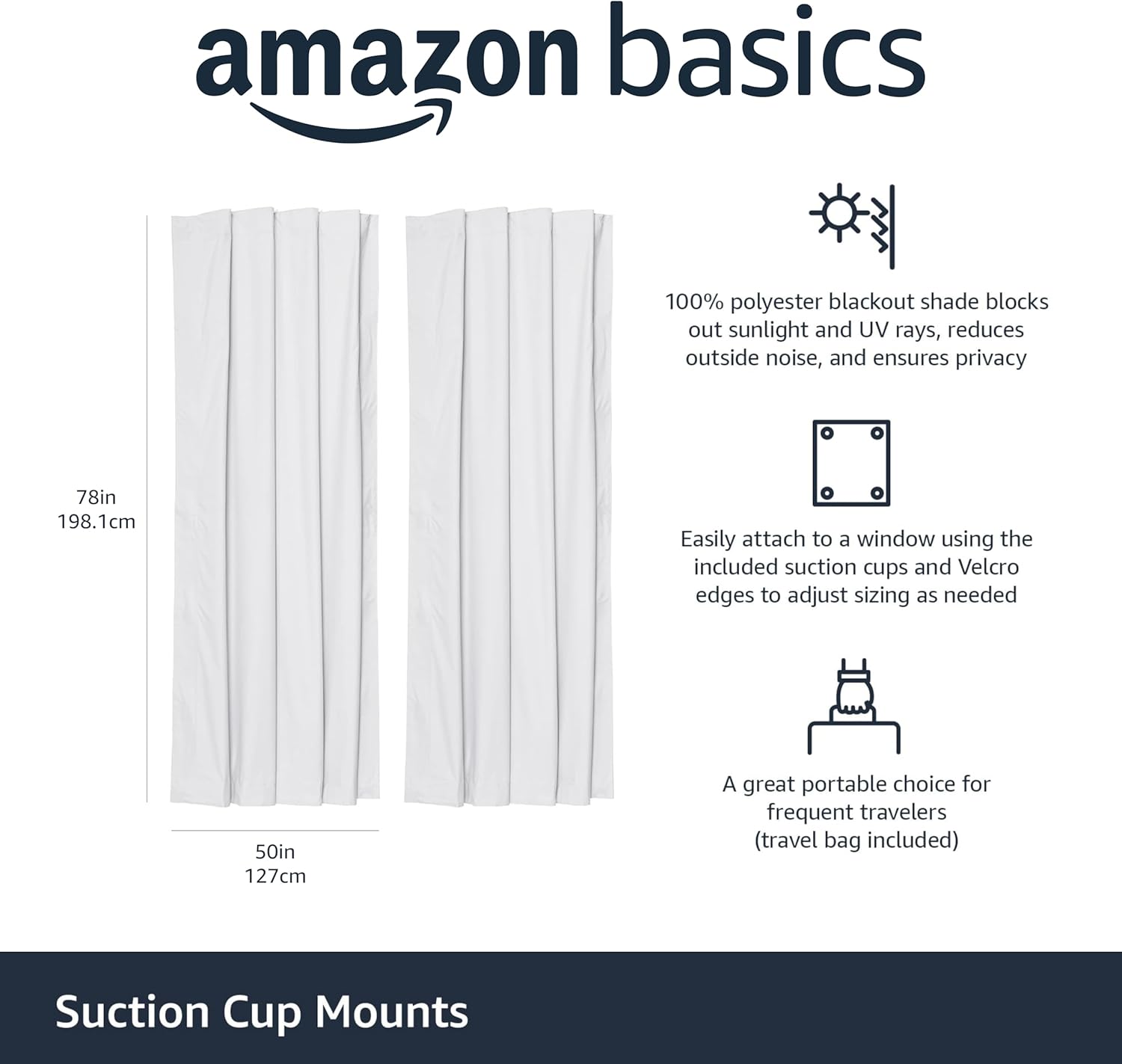 Amazon Basics Portable Blackout Curtain Shade with Suction Cups, 50"W x 78"L, 2-Pack, White