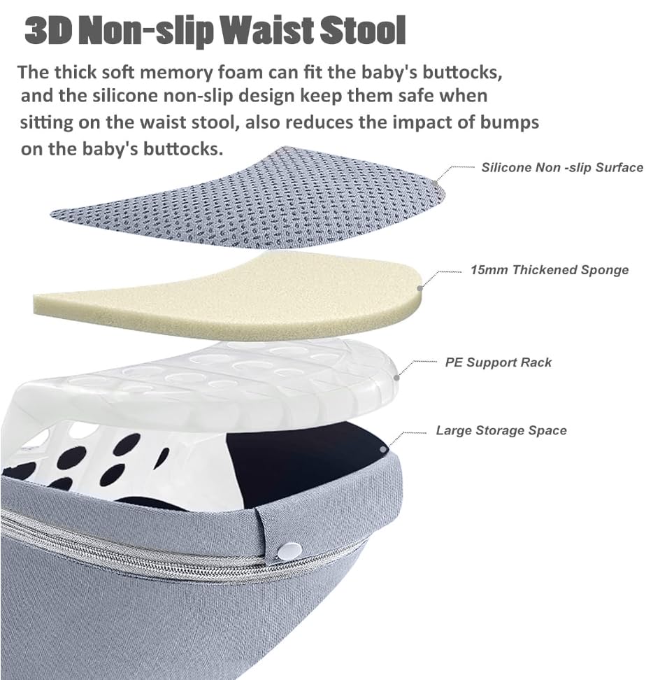 - Ergonomic Hip Seat: The waist stool maintains the baby's M-shape during carrying, helping their skeletal development. The wide waistband make the hip seat to fit snugly against the parent's waist, helping to share the weight during carrying baby. The inward sloping angle of the hip seat keeps the baby close to the parent's body comfortably and reduces bumps and shaking when parents walking. Besides, it make baby feel safety in their arms.