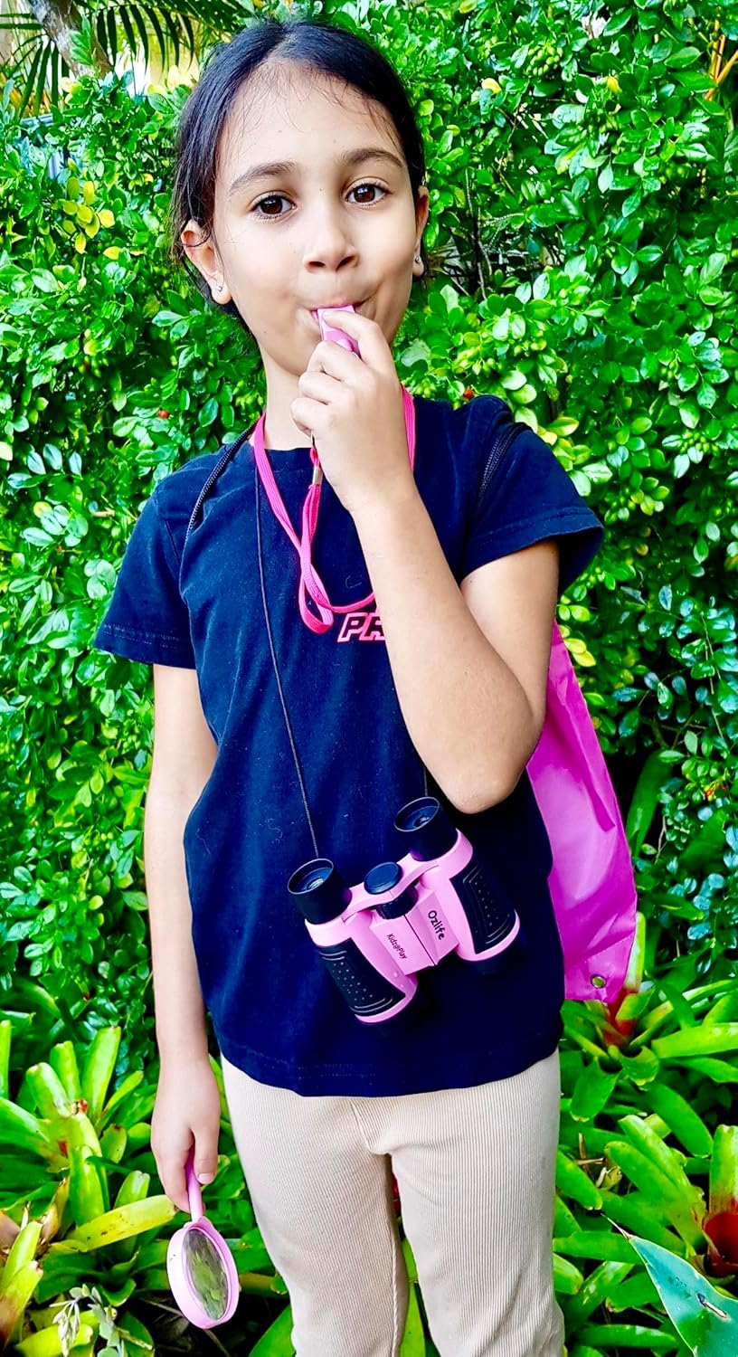 - 🐞BINOCULARS - 5x30 magnification glass optical lenses for viewing nature up close with flexible rubber eye pieces protecting delicate eye area. Shock resistant with nonslip grip ergonomically designed for small hands. Binoculars come with lanyard for easy carrying and a protective soft case that can attach to a belt. Lightweight and easy to use for hours of carefree fun for boys and girls.