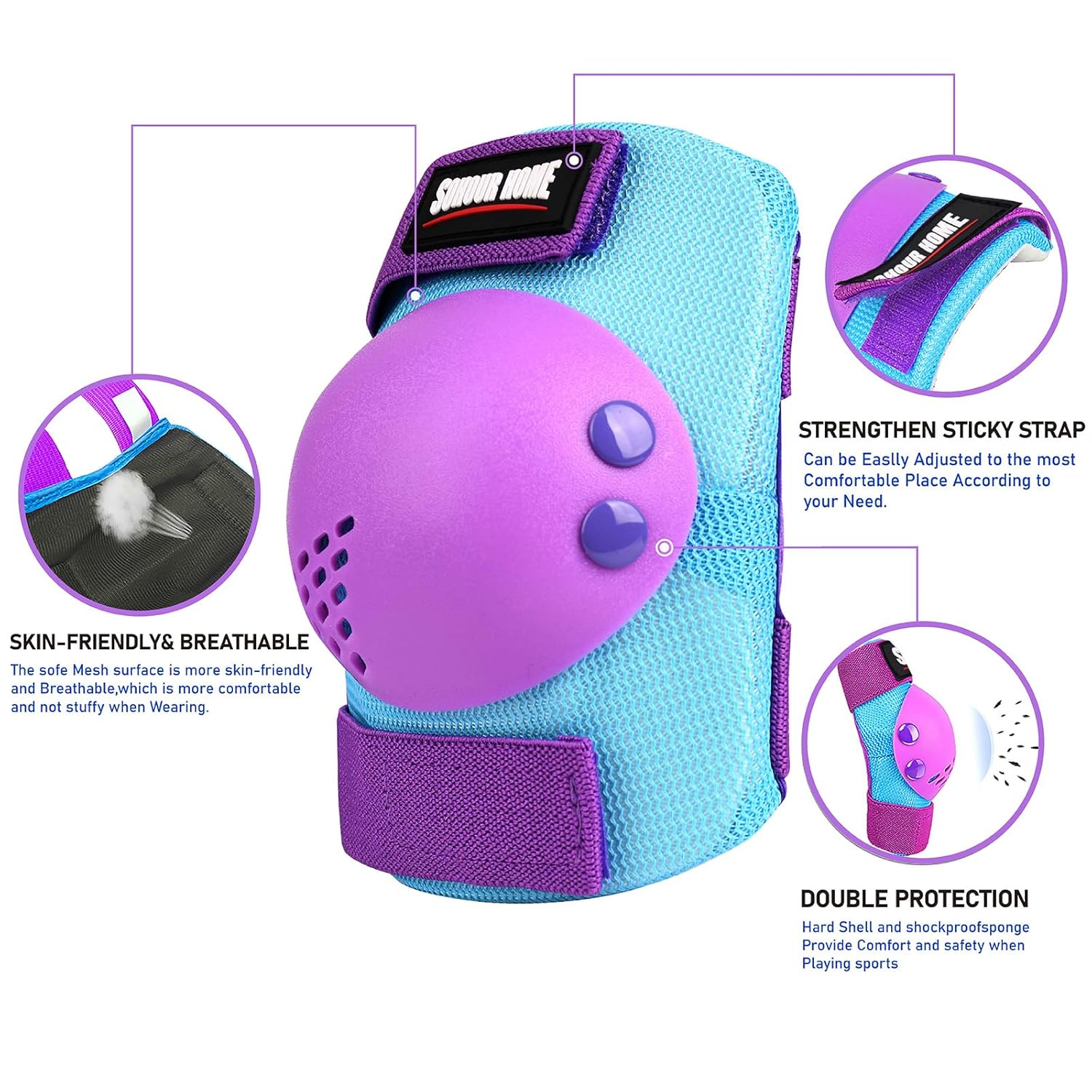 - 🌸【Recommended Age for Kids 】SOHOUR HOME Kids Knee Pads and Elbow Pads 6 pack contains: 2 pcs Knee pads /2 pcs Elbow Pads / 2 pcs Wrist Guards With Portable Breathable Canvas Mesh Bag. Size Suggest: S: for 3-7 Years old, M: for 6-15 Years old.