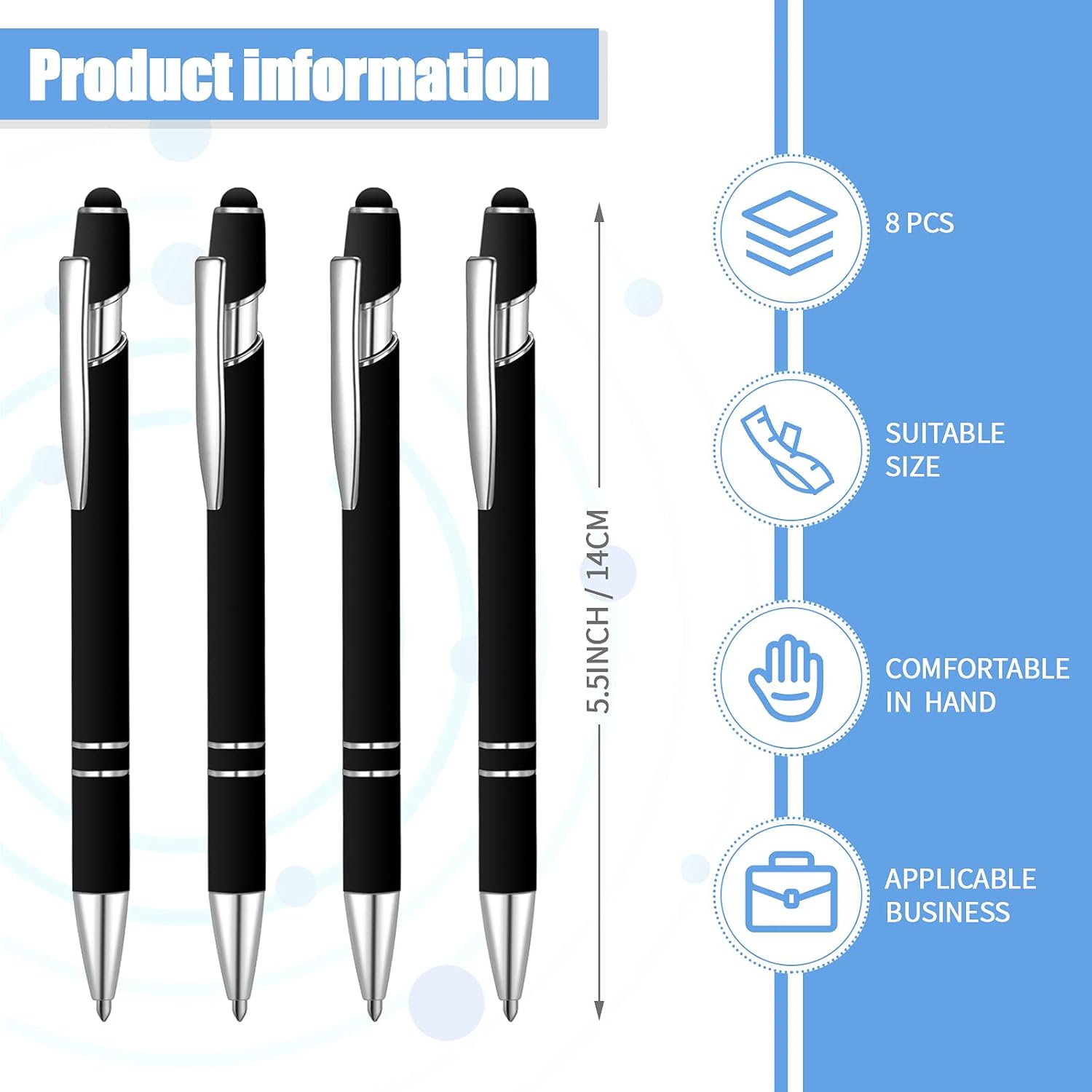 - Sufficient quantity: You will receive 8 pieces ballpoint pens with stylus tips, enough for your daily needs and replacements; The size of a single ballpoint pen with stylus tip is 5.5 x 0.4 inch/ 14 x 1 cm, which is the proper size for a pen; Note: The ink on the refill is black