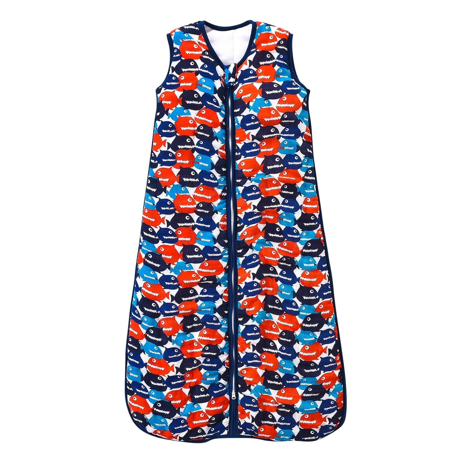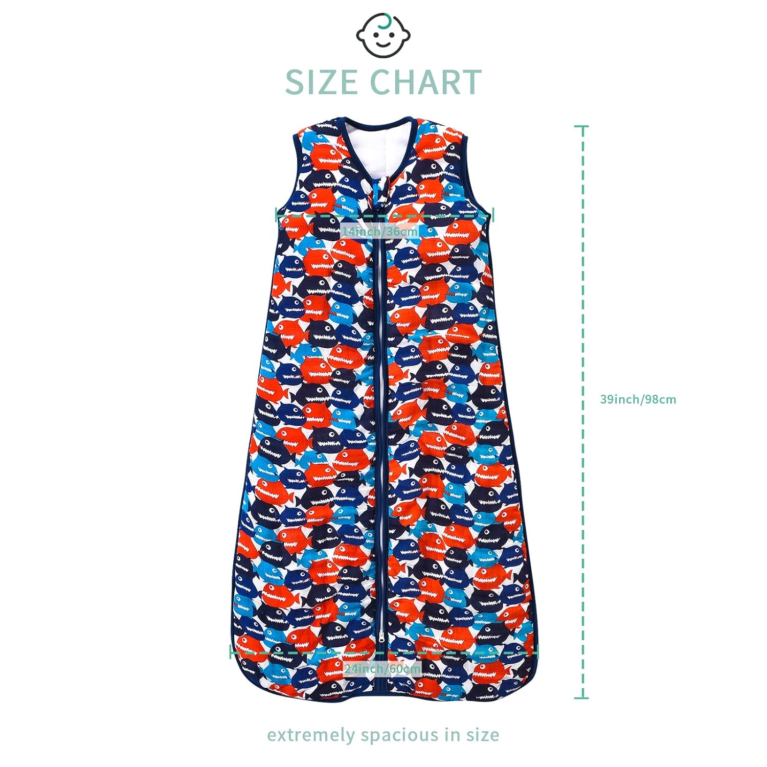- Size and Patterns: The sleeping bag is 39" long and suitable for 2-4T toddlers. Please refer to the size chart for more information. For both boys and girls, we offer three patterns to choose from: rhinoceros, cars, and small fish. Suitable warmth for your baby in room temperature between 61℉-68℉.