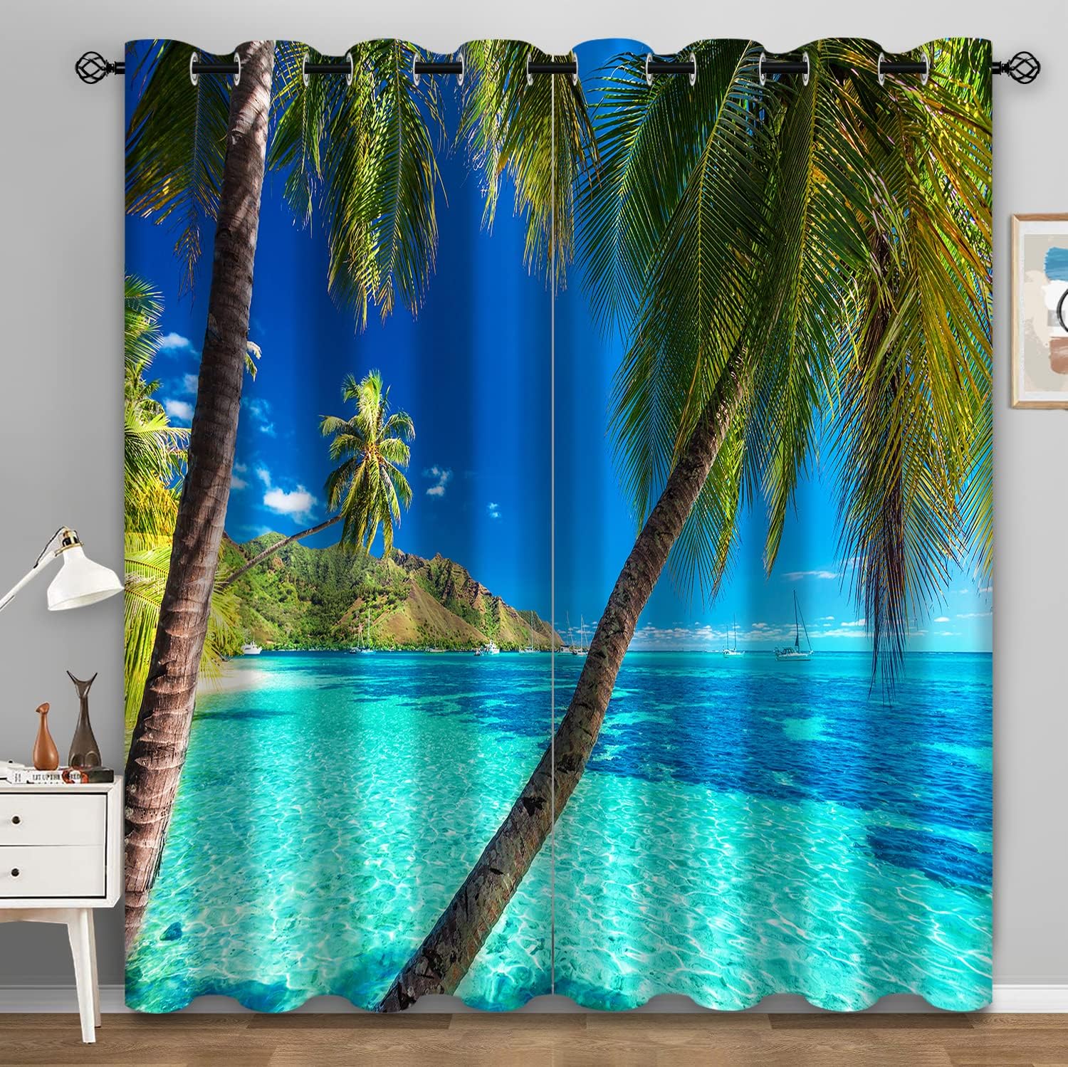 Aimego Palm Trees Blackout Curtains Blue Ocean Tropical Hawaiian Scenery Window Drapes Decor for Bedroom Living Room Grommet Top Room Darkening Curtains 2 Panel Set, 52"X84"