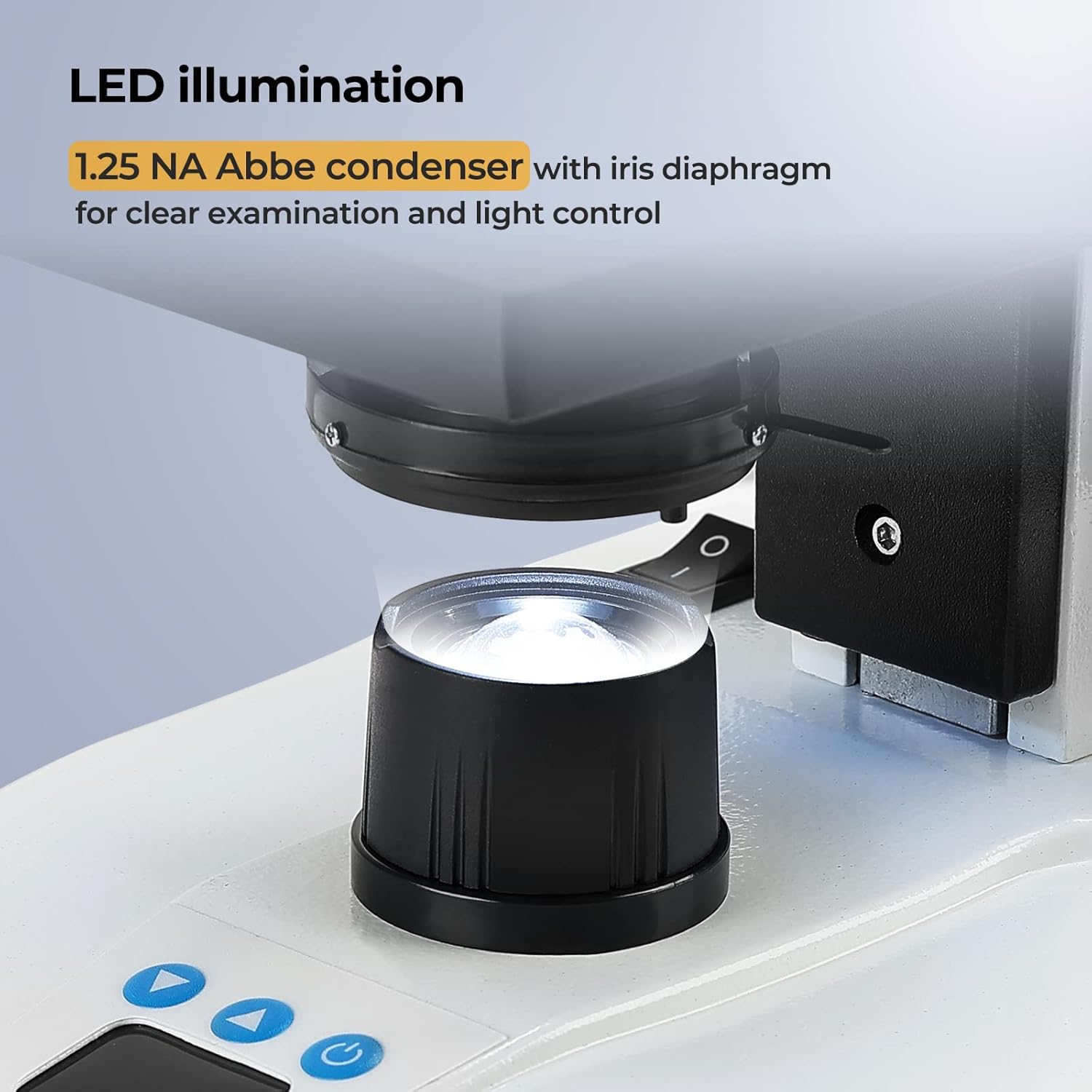 - [Eyepieces & LCD Screen]: Equipped with wide-field 10X/25X glass eyepieces fixed at an ergonomic 30 degree tilt to reduce neck strain, easily adjustable for different interpupillary distances without losing focus, 5MP Electronic eyepiece and 360 degree 7" large LCD display allows you to get a larger field of view directly from the screen without an external large screen display, provide a more comprehensive view and enable sharing. 4 Achromatic objectives offer 4x 10x 40x(s) 100x(Spring Oil).