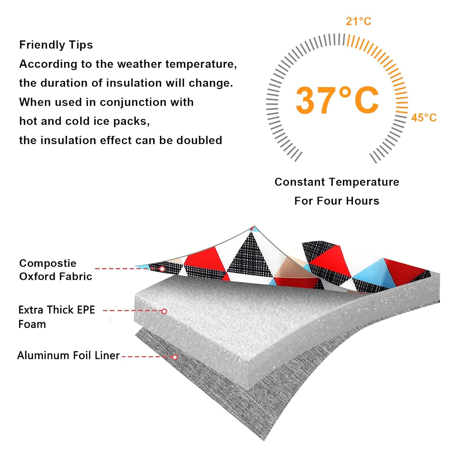 - HIGH QUALITY MATERIALS: Made of high quality water-resistant composite oxford fabric, 8mm extra-thick EPE foam and food-grade aluminum foil liner. No odor, non-toxic, food safe, durable, lightweight. Effectively keep bottles stay cold, warm or fresh for hours, it keeps breast milk fresh.