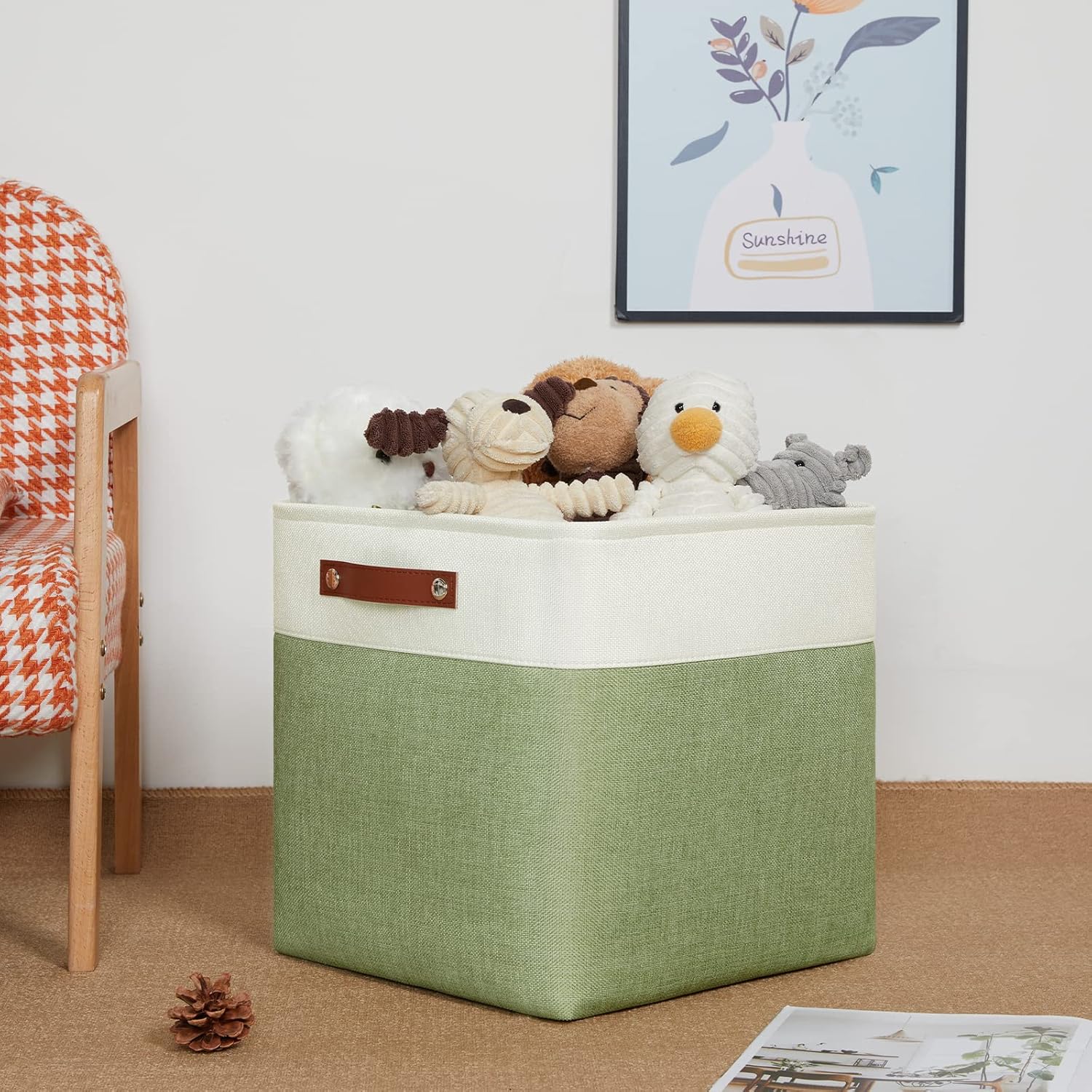 DULLEMELO Storage Baskets for Organizing, Linen Closet Organizers and Storage Baskets for Dog Toy Box, 13 Inch Decorative Cube Storage Bins with handle for Baby Gift Basket(4 Pack - 13" White&Green)