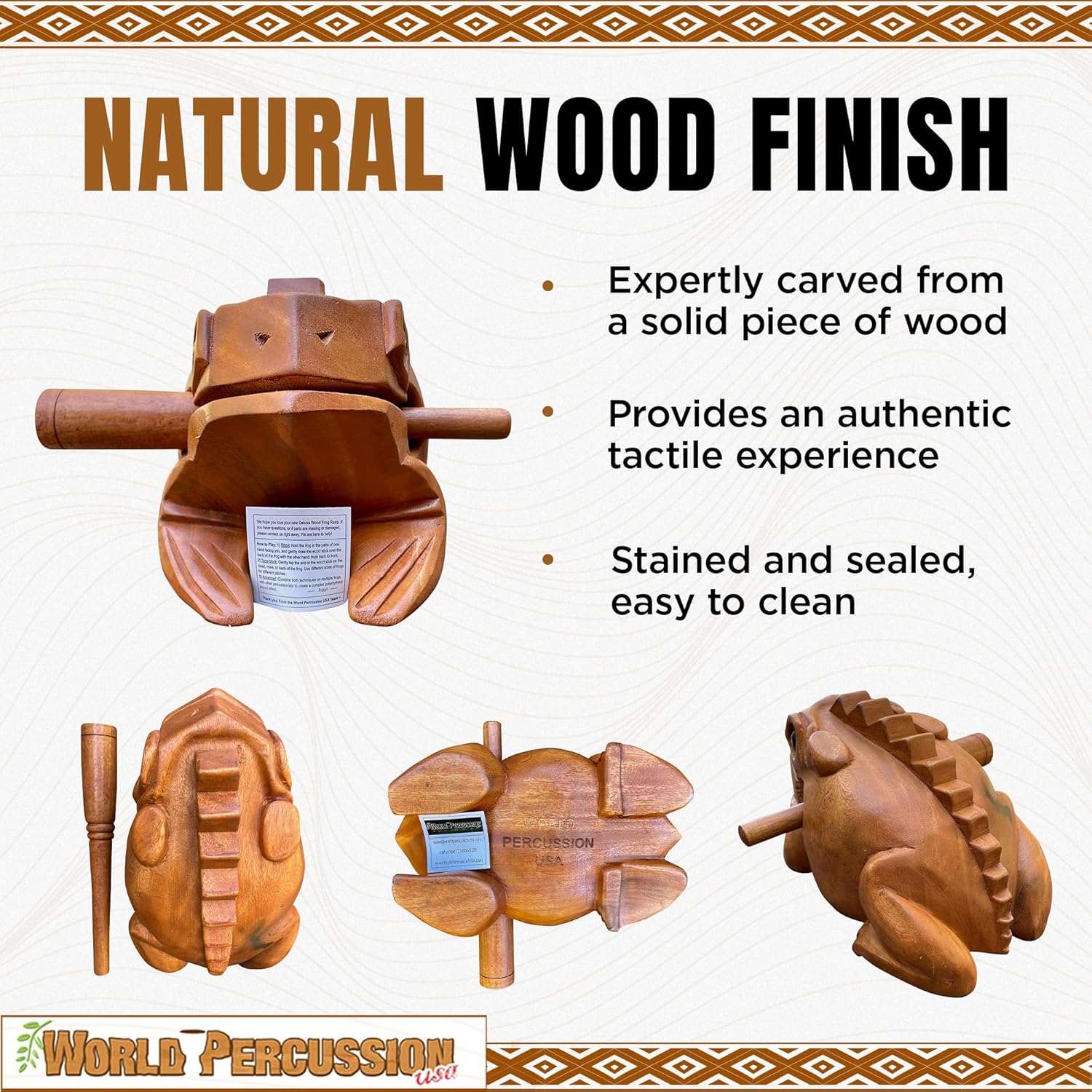- NATURAL WOOD FINISH: Carved from a solid piece of wood, this traditional frog guiro features a natural brown wood finish that ensures durability and longevity without any paint to chip. This wooden frog instrument includes a stick for creating a variety of frog-like sounds.