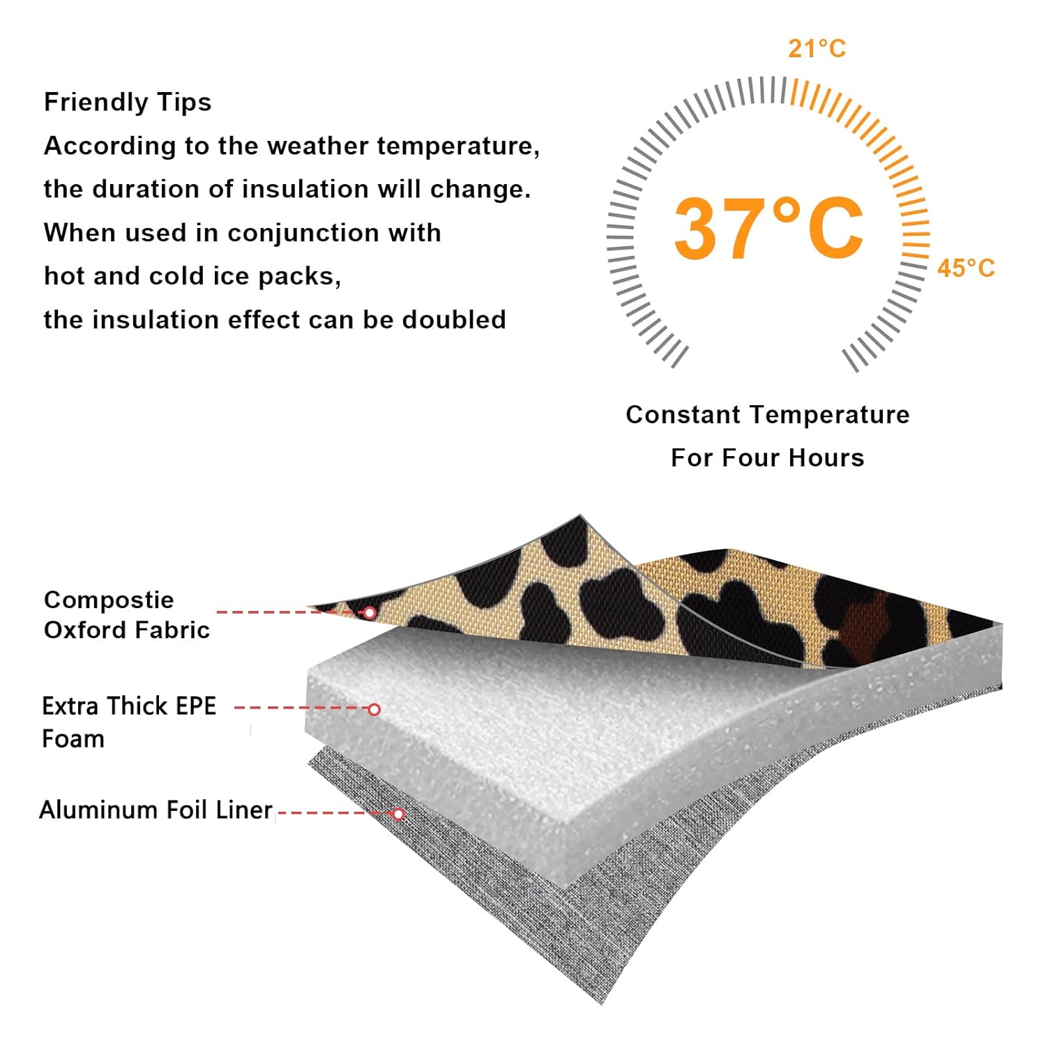 - HIGH QUALITY MATERIALS: Made of high quality water-resistant composite oxford fabric, 8mm extra-thick EPE foam and food-grade aluminum foil liner. No odor, non-toxic, food safe, durable, lightweight. Effectively keep bottles stay cold, warm or fresh for hours, it keeps breast milk fresh.