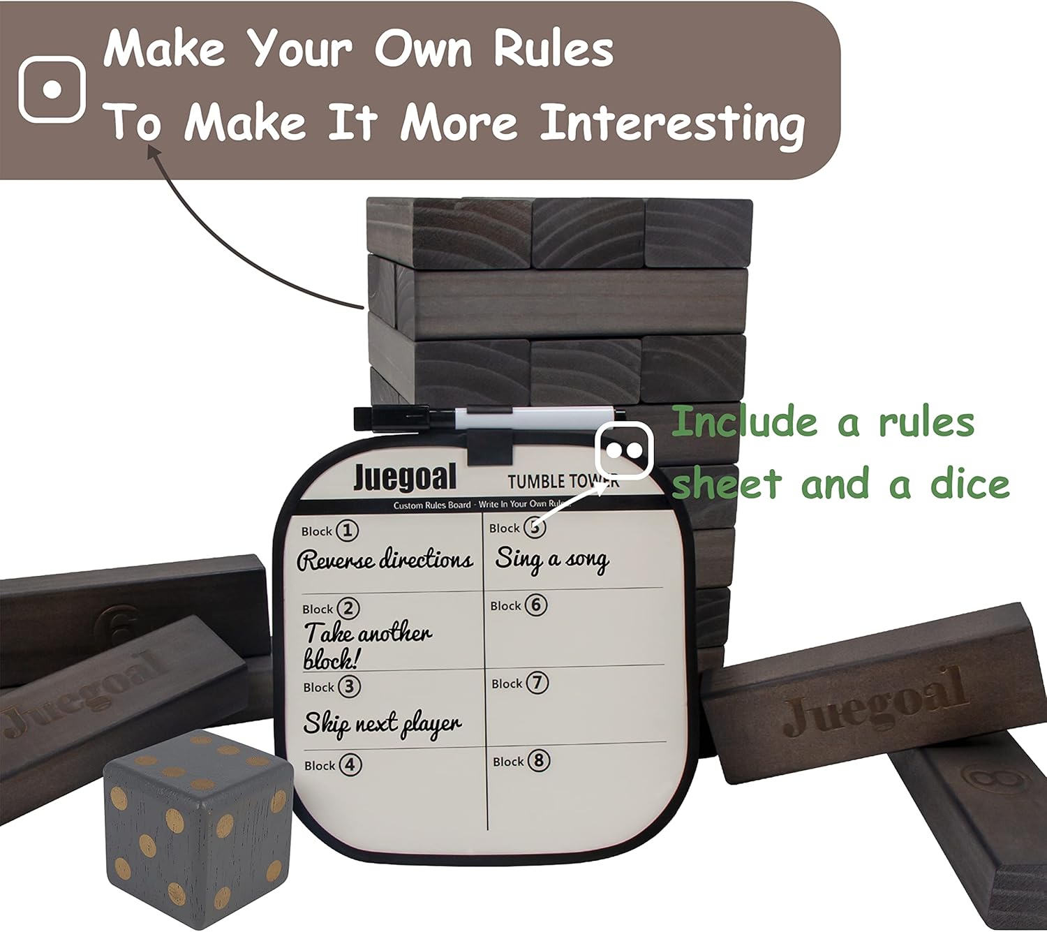 - GIANT TIMBER GAME SET: Juegoal grey color giant tumble tower set comes with 54 pieces wooden tumble blocks, 1 pcs wooden dice, 1 pcs game board with pen and a zipper bag. Each block is 5.9 x 2 x 1.2 inch, 2FT (18 rows) could be grown up to 4FT tall tower when played. A great fun, fast-paced stacking game and indoor or outdoor playing game for all ages.