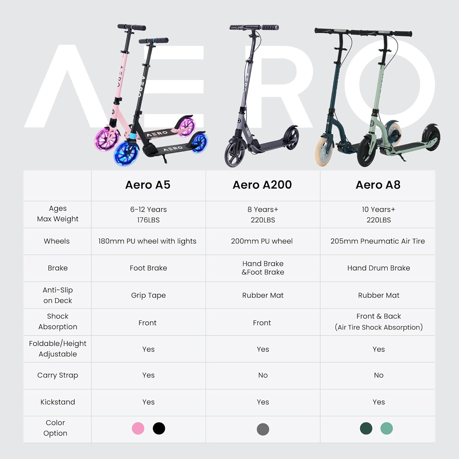 - DESIGNED FOR KIDS, TEENS AND ADULTS: Aero A200 NON-ELECTRIC kick scooter is specially designed for big kids 8-12, teens, and adults. It is perfect for both recreational sports and short-distance commuting.