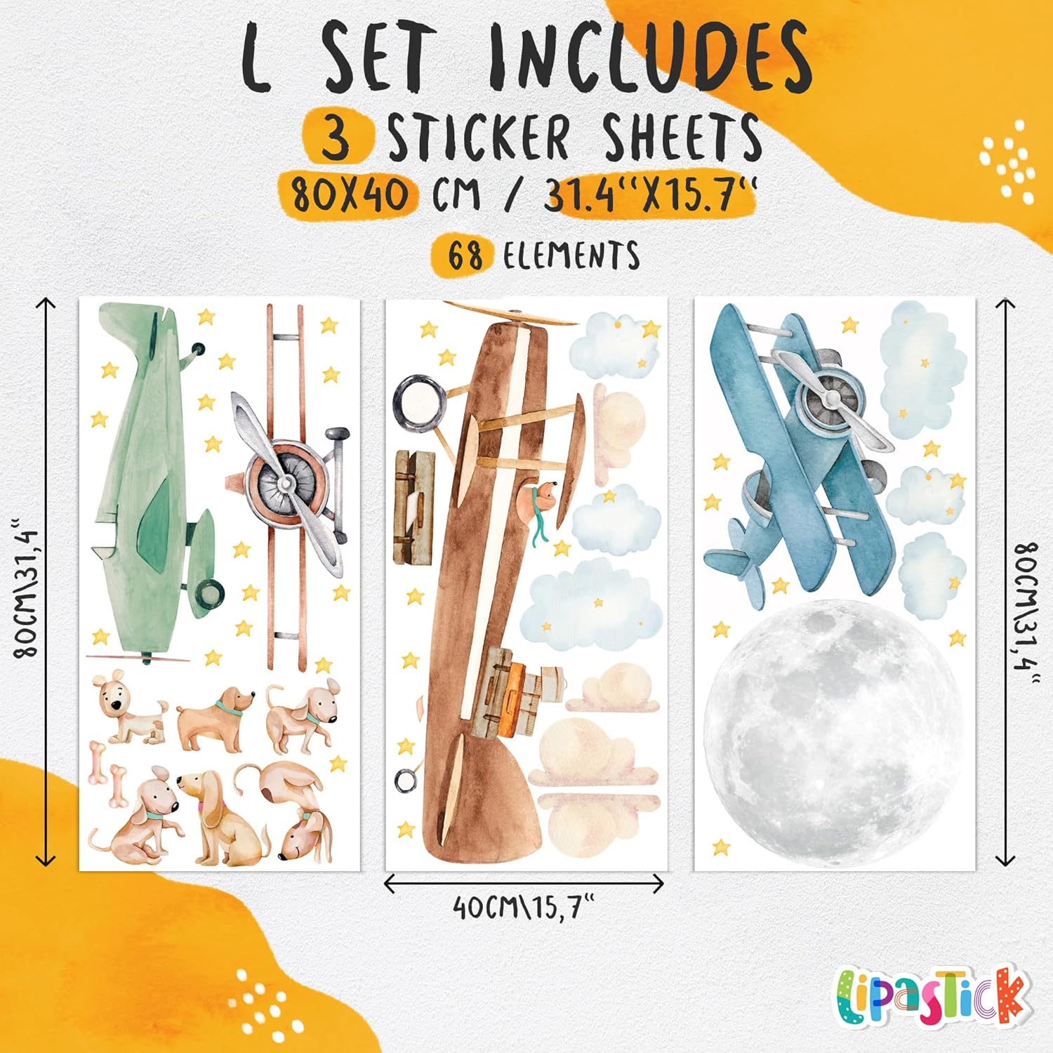 Airplane Wall Decals by Lipastick - 47-Piece Watercolor Vintage Plane Stickers for Kids, Boys Room, Baby Nursery, Toddler Bedroom Decor - Premium Vinyl Aircraft Art - L Size