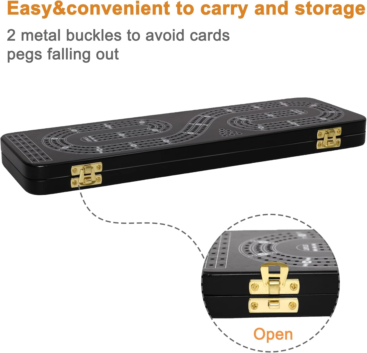 - 【Portable Metal Buckle】 The Cribbage Board has a stabilize metal buckle to protect the internal storage compartment, allowing easy and safe storage of cards and metal pegs when not in use. This makes it easy to carry around!