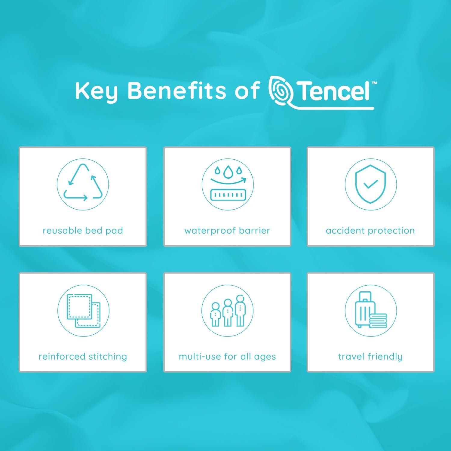 - 100% TENCEL Cover: Crafted with TENCEL, a botanic and pure fiber derived from eucalyptus trees, this waterproof bed pad provides a soft, breathable surface for kids, families, and pets. TENCEL absorbs 70% more moisture than cotton, keeping surfaces dry and comfortable during potty training or nighttime accidents.