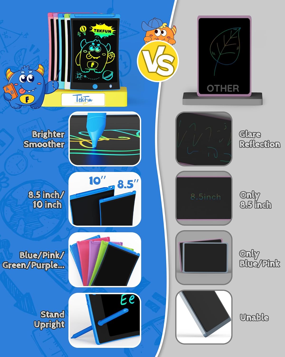 - Eye-Friendly: Say goodbye to blue light and glare with TEKFUN's LCD screen. Your child can draw for hours without straining their eyes, making it a great electronic alternative for preventing visual impairment