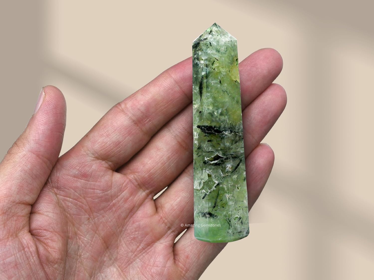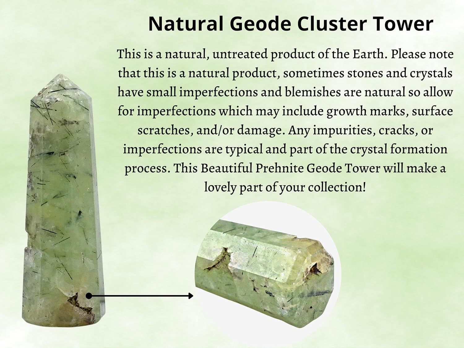 - Prehnite Crystal Tower will uplift and purify the energy (if its point is not damaged), so you can place it in any area that needs to be re-energized with strong energy. Length of this tower / wand / obelisk / point is 2" inch to 3" inch (5cm to 7.5cm) & width is 0.75 inch (2 cm).