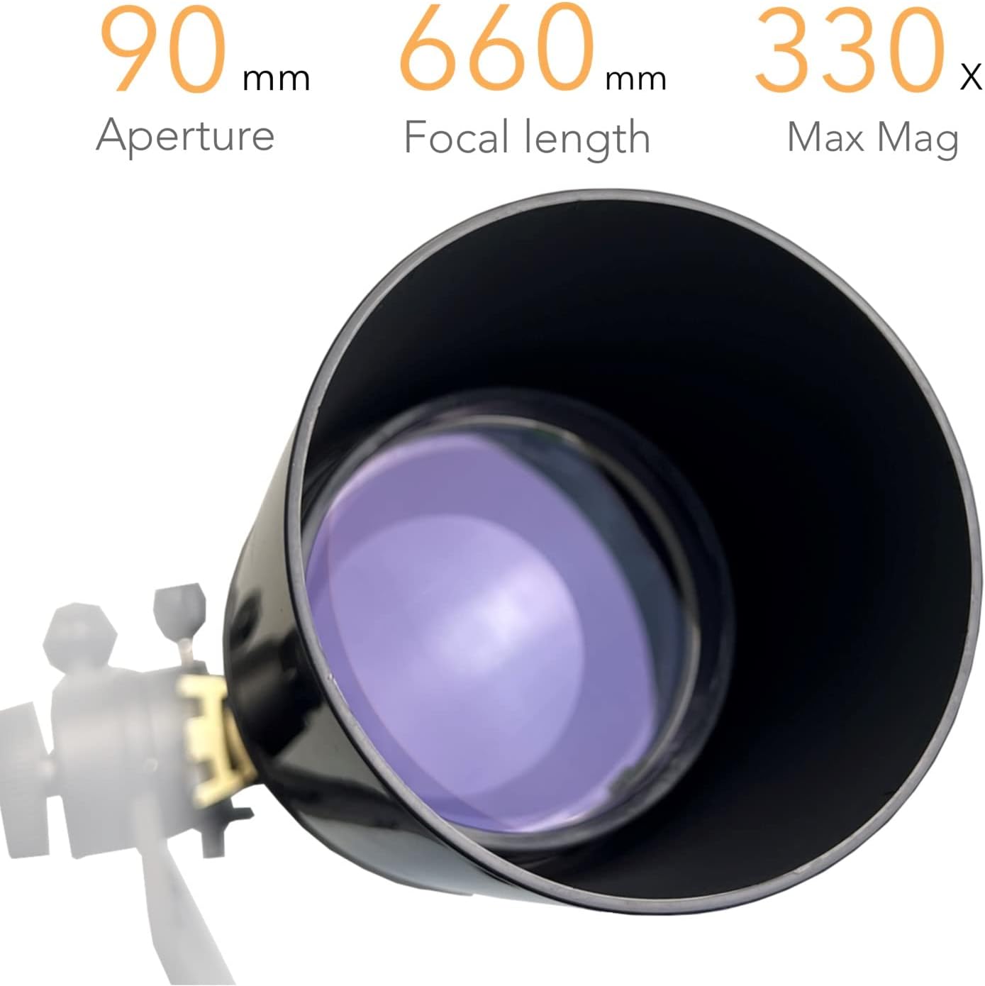 - 【Fully Multi Coated Glass Optics 】Experience the breathtaking beauty of the night sky with this professional telescope for kids, celebrated for this outstanding fully Multi Layer coated glass optics featuring Magnesium Difluoride coatings. These advanced Refractor telescope deliver images of unparalleled clarity and sharpness, making celestial observations a truly immersive experience. Boasting a 90mm aperture and 660mm focal length, this telescope is perfectly suited for a wide range of celestial wonders, including the Moon, Jupiter, Mars, and other stars when weather conditions allow. It's the ultimate telescopio profesional para ver planetas.