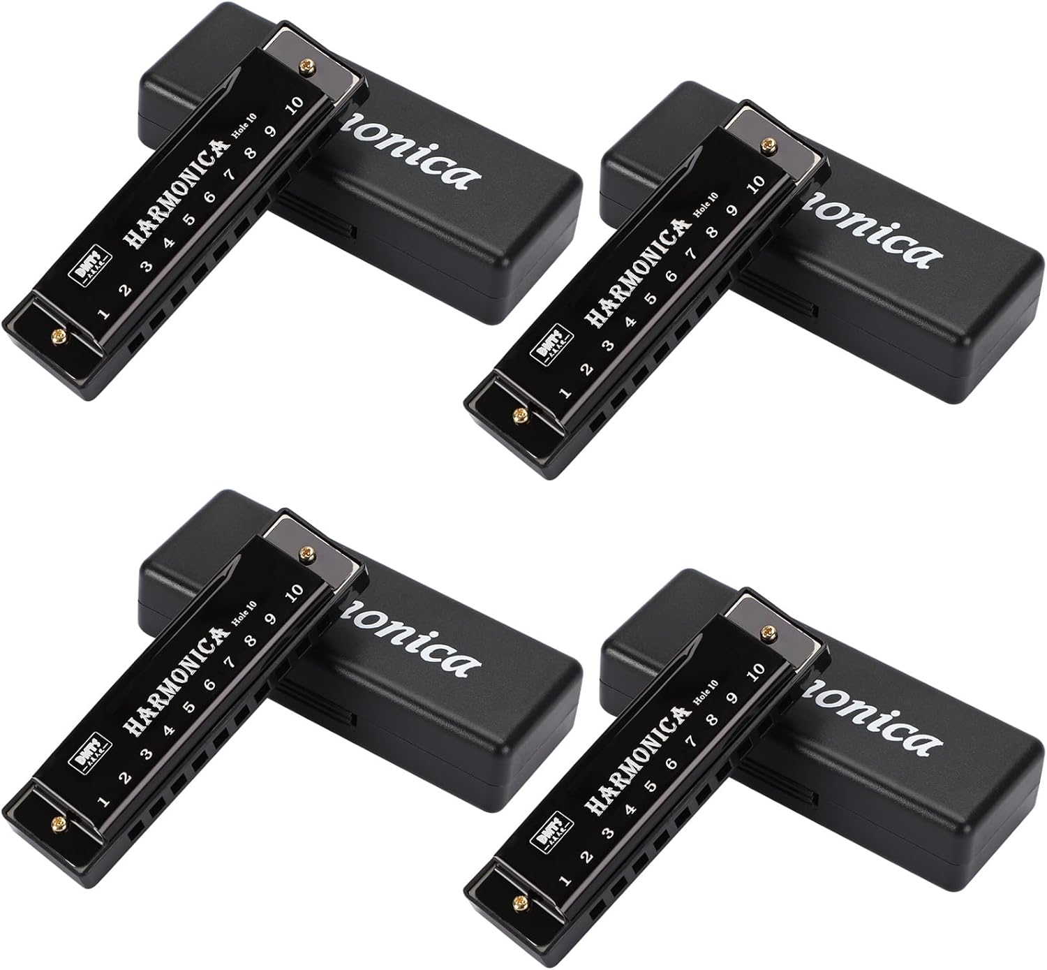 UPINS Harmonica, 4PCS Key of C 10 Hole 10 Tones Titanium Color Harmonica with Case for Beginner(Black)