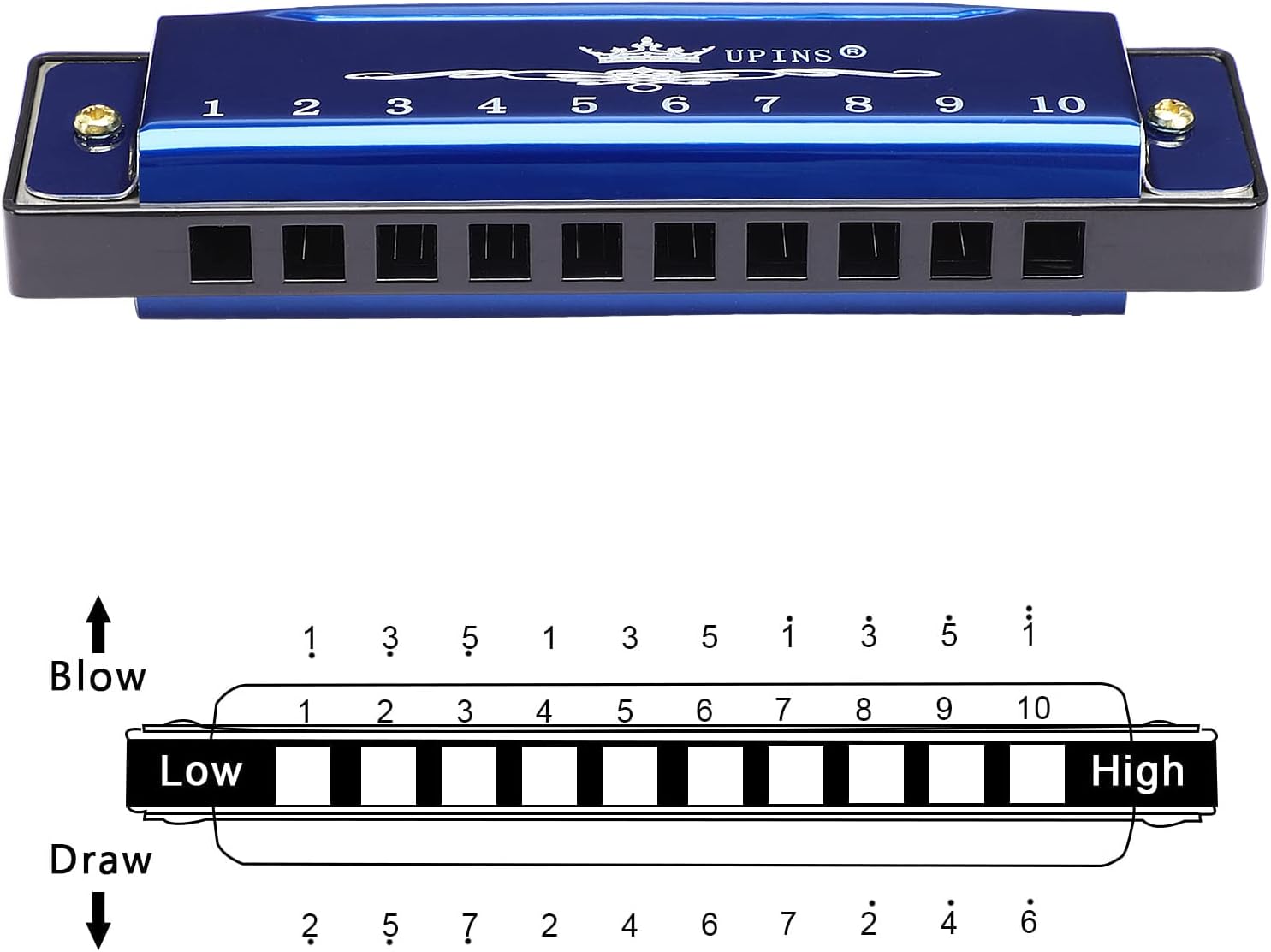 UPINS Harmonica, 4PCS Key of C Blues 10 Hole 20 Tones Titanium Color Harmonica with Case Cleaning Cloth for Beginner Students Kids (Blue)