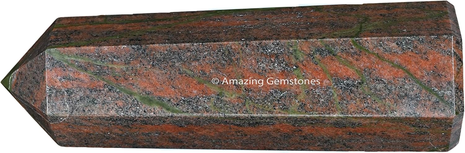 - Large Unakite Crystal Tower will uplift and purify the energy (if its point is not damaged), so you can place it in any area that needs to be re-energized with strong energy. Length of this tower / wand / obelisk / point is 5.5" inch to 6" inch (13.5cm to 15cm) & width is 2 inch (5 cm).
