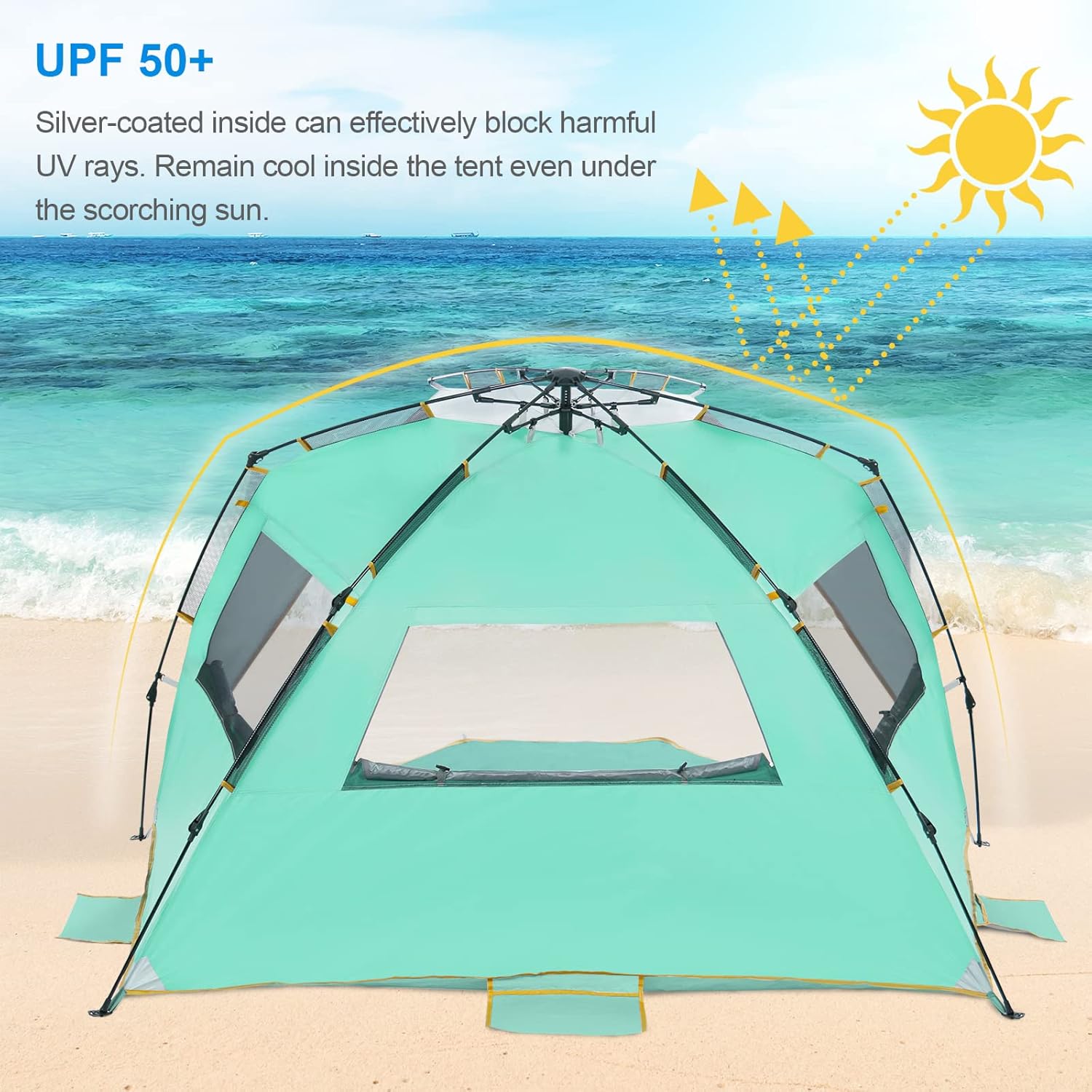 - Easy Setup & Super Stable: The specially designed spring opening system shows an industry-leading level of improvement. One person can set up the beach tent easily in seconds. Compared to the drawstring design, this one is faster, effortless, and saves more time. The 8.5 mm thick fiberglass poles make the tent stronger. Equipped with 3 sandbags, 4 wind ropes and 10 stakes to ensure stability and prevent it from being blown away in the wind.