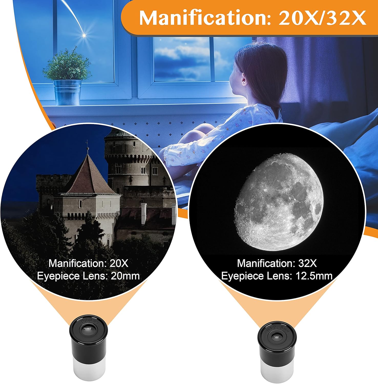 - FULLY MULTI-COATED: Refractor telescope with all optical glass. Anti-reflective coating provides low light reflectance, increased light transmission to provide brighter, clearer images and eye protection. You can explore the moon's surface more clearly.