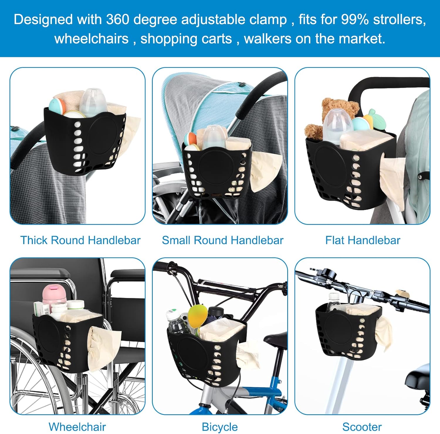 - 360 ° Rotatable Clip : Strong and stable clip allows 360 ° rotation, you can install the stroller basket on any angle . And the width of the clip can freely adjust, it compatible with a maximum diameter of 5.5 cm/2.1 in. This stroller organizer fits almost all strollers.