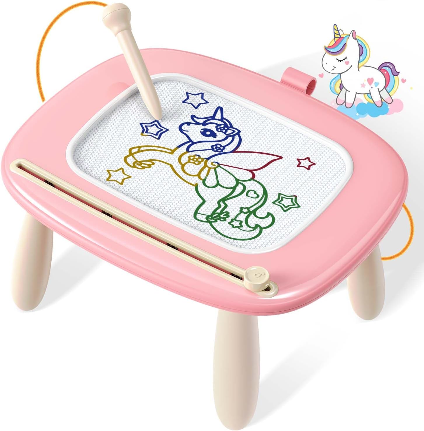 - Doodle Board with Newest Designs: The pen is ergonomic with a round pen tip that is more comfortable for kids to hold and draw. The silicone pen holder is easy to take out and put in. The pen rope effectively prevents the pen from being lost. The special silicone handle on the back of the drawing board is more comfortable and convenient for your kids to pick up.