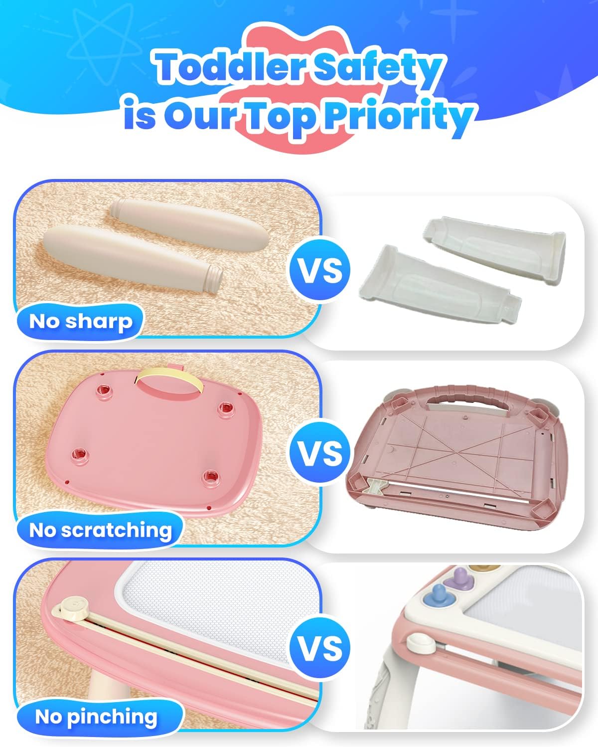 - Safe and Eco-friendly Toy: Our drawing board made of non-toxic, BPA-free, eco-friendly ABS plastic material, is a clean and eco-friendly way to satisfy your child's drawing. The eraser knob glides easily and smoothly for kids. Erases in a second for a clean drawing area for new drawings. and won't hurt your kids' delicate hands. Our mom can put our baby in high chair with the drawing board and it keeps him busy & happy while you clean or cook. Complete peace of mind to let children play alone.