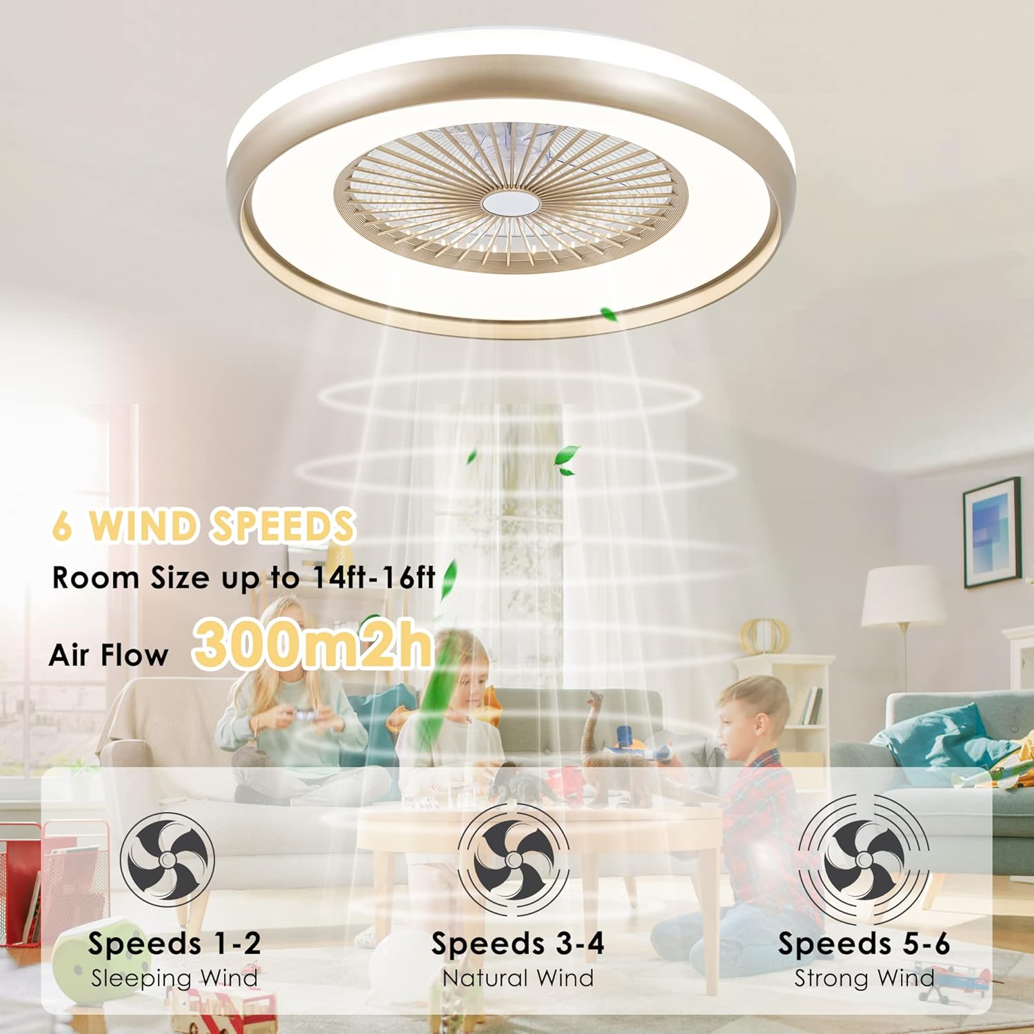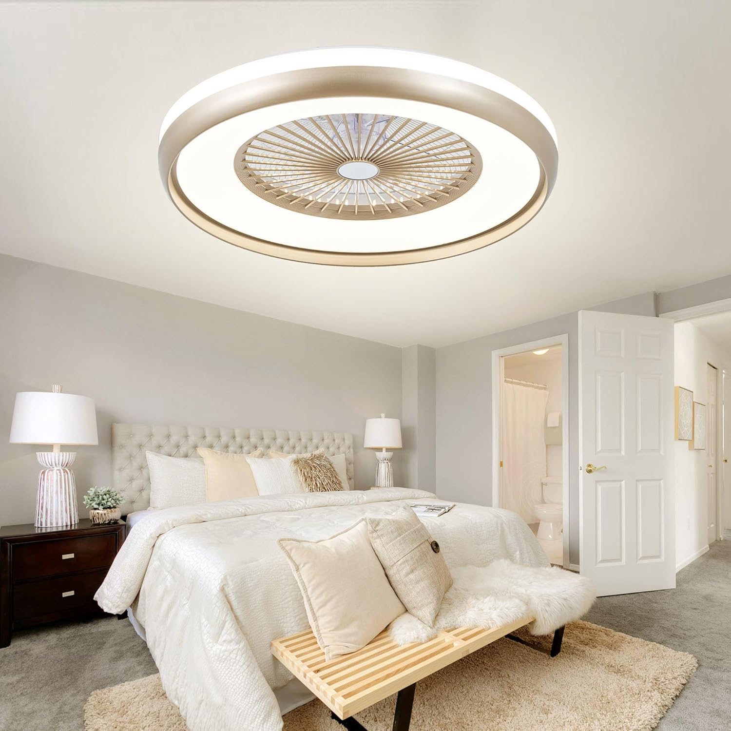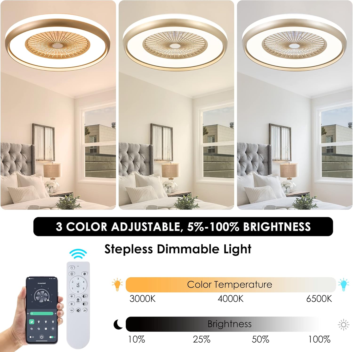24" Bladeless Ceiling Fan with Light Remote, Smart LED Ceiling Fans with App Control, Modern Low Profile Dimmable Light Ceiling Fan for Bedroom Living Room Gold