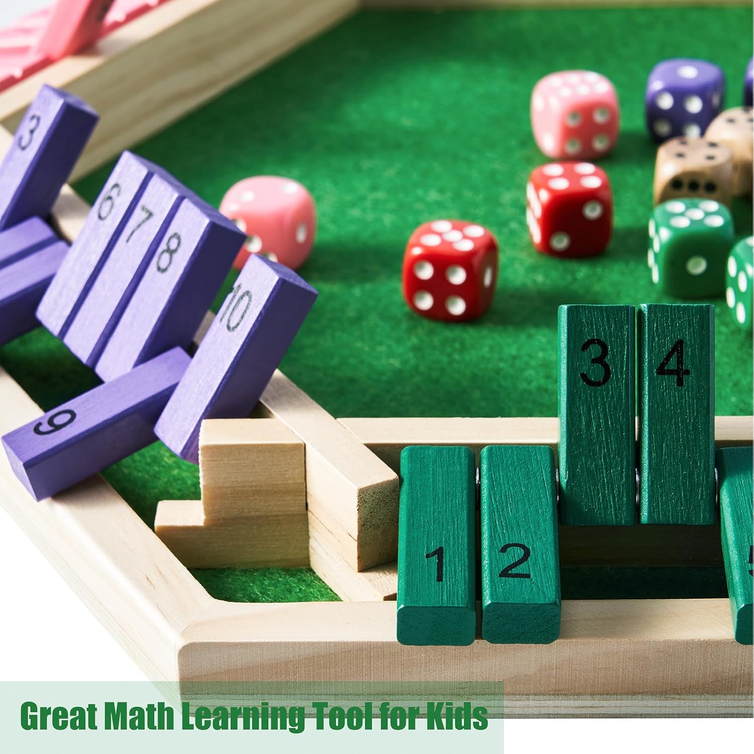- GOOD LEARNING TOOL: This shut the box game can be played from 1 to 6 players, gathering more people to play together, bringing more fun, more laughters and more challenge, the felt board designed for soft rolling, smooth and bright colored dices, clear numbers which will never faded, perfect tool for kids to practise maths skills, such as calculating and number bonds, develops concentration