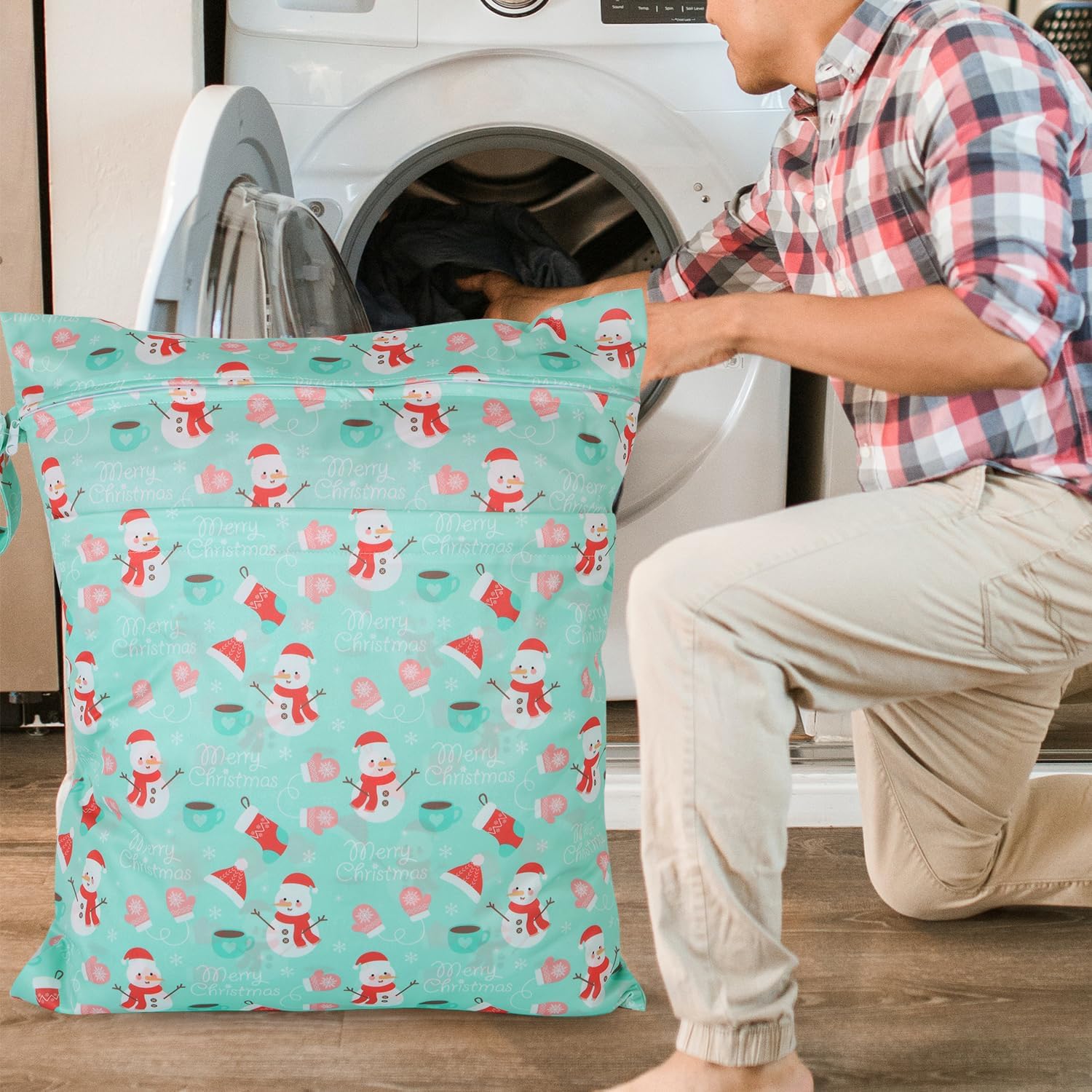 • 2 ZIPPERED POCKETS & HANDLE DESIGN: The 2 pack laundry bags are designed with 2 zippered compartments to keep wet and dry clothes separately, or separate dirty and clean diapers. Keep dry and clean. There's a handle with a button on one side for hanging up, convenient to carry and attach to your stroller, doorknob, towel rack, hook or handbag.