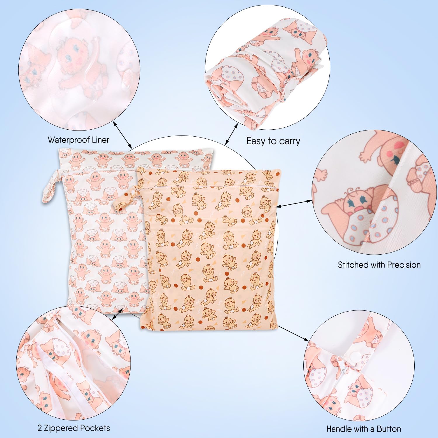 - 2 ZIPPERED POCKETS & HANDLE DESIGN: The 2 pack laundry bags are designed with 2 zippered compartments to keep wet and dry clothes separately, or separate dirty and clean diapers. Keep dry and clean. There's a handle with a button on one side for hanging up, convenient to carry and attach to your stroller, doorknob, towel rack, hook or handbag.