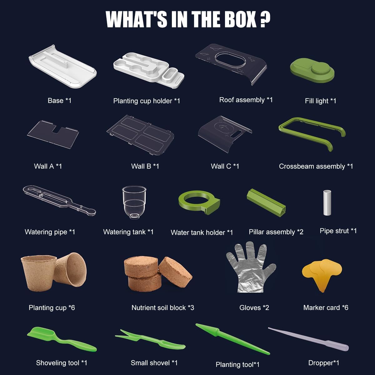 - [Kids Gardening Plant Growing Kit] This greenhouse sunshine room plant kit comes with 3 planting tools including 1 soil shovel, 1 small shovel and 1 planting tools, 1 water dropper for irrigation system, 6 planting pots, 6 marking placards and 3 nutrient soil. Note: the nutrient soil needs to soak before you use it and the seed is not included, you can prepare any kinds of your favorite flower and plant seed to plant.