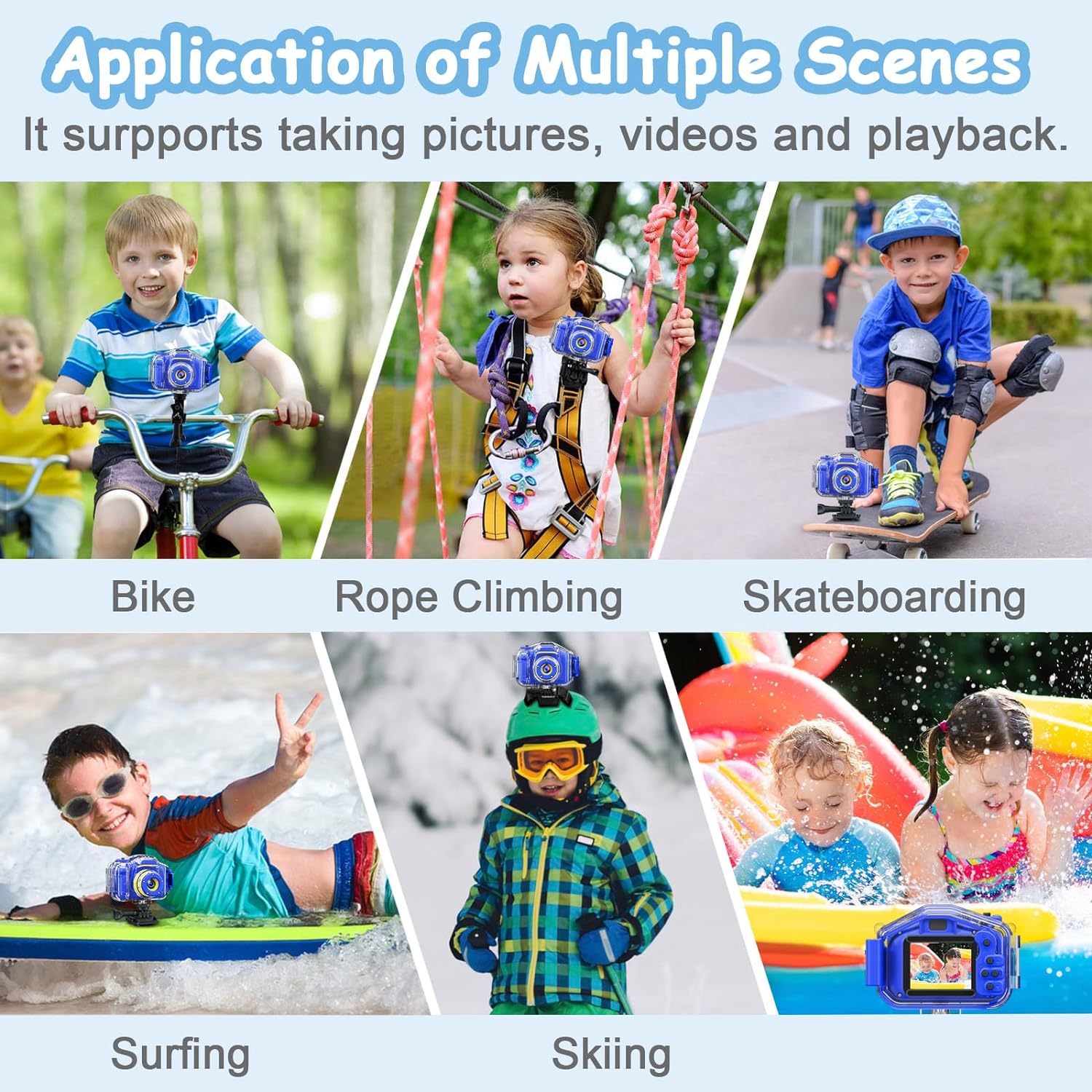 - Other Accessories and After Service: Versatile mounting kits which allows the kids camera to be attached to any flat surface (skateboards, helmets) and bikes. Package included a durable lanyard for children to hang the camera on neck, carry everywhere. After Service, any problem about our kids camera feel free contact