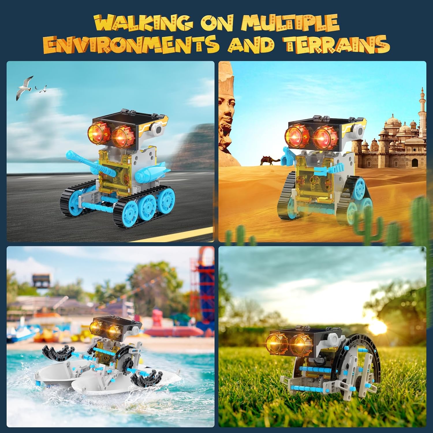 - Upgrade Design Features-Independently Wesfuner 2023 innovated and designed and upgraded STEM solar robots toys kits, the following 5 features optimization improvements: Two new concept shapes tank and engineering vehicle, 2 kinds of power source supply, enlarged solar panel area, 2 kinds of replaceable heads, large-size accessories and deepening the optimization and improvement of the installation hole, accurate track design, more firm, solve the problem that accessories are easy to fall off