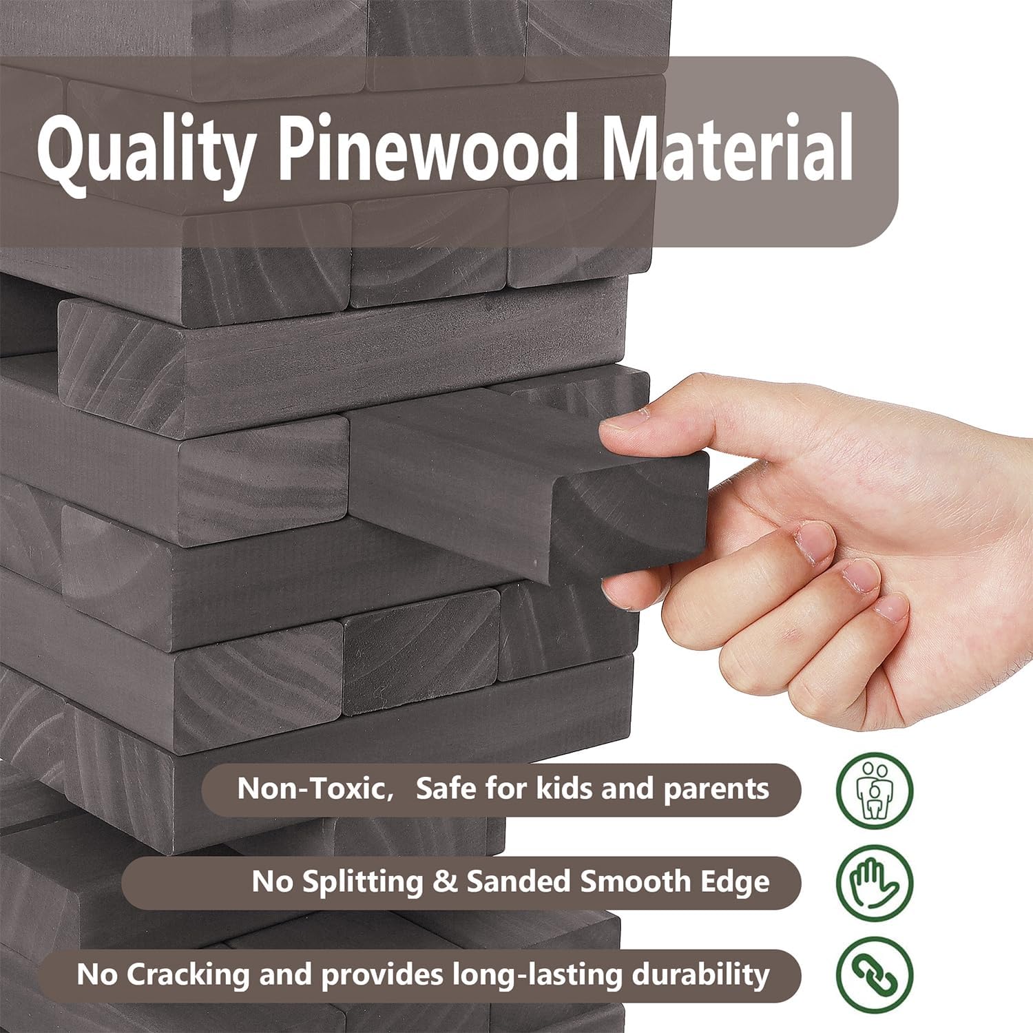 - Giant Size Timber Game Set: Juegoal large size grey color giant tumble tower set comes with 54 pieces wooden tumble blocks, 1 pcs game board with pen and a zipper bag. Each block is 6.9 x 2.3 x 1.2 inch, 2FT (18 rows) could be grown up to 4FT tall tower when played. A great fun, fast-paced stacking game and indoor or outdoor playing game for all ages