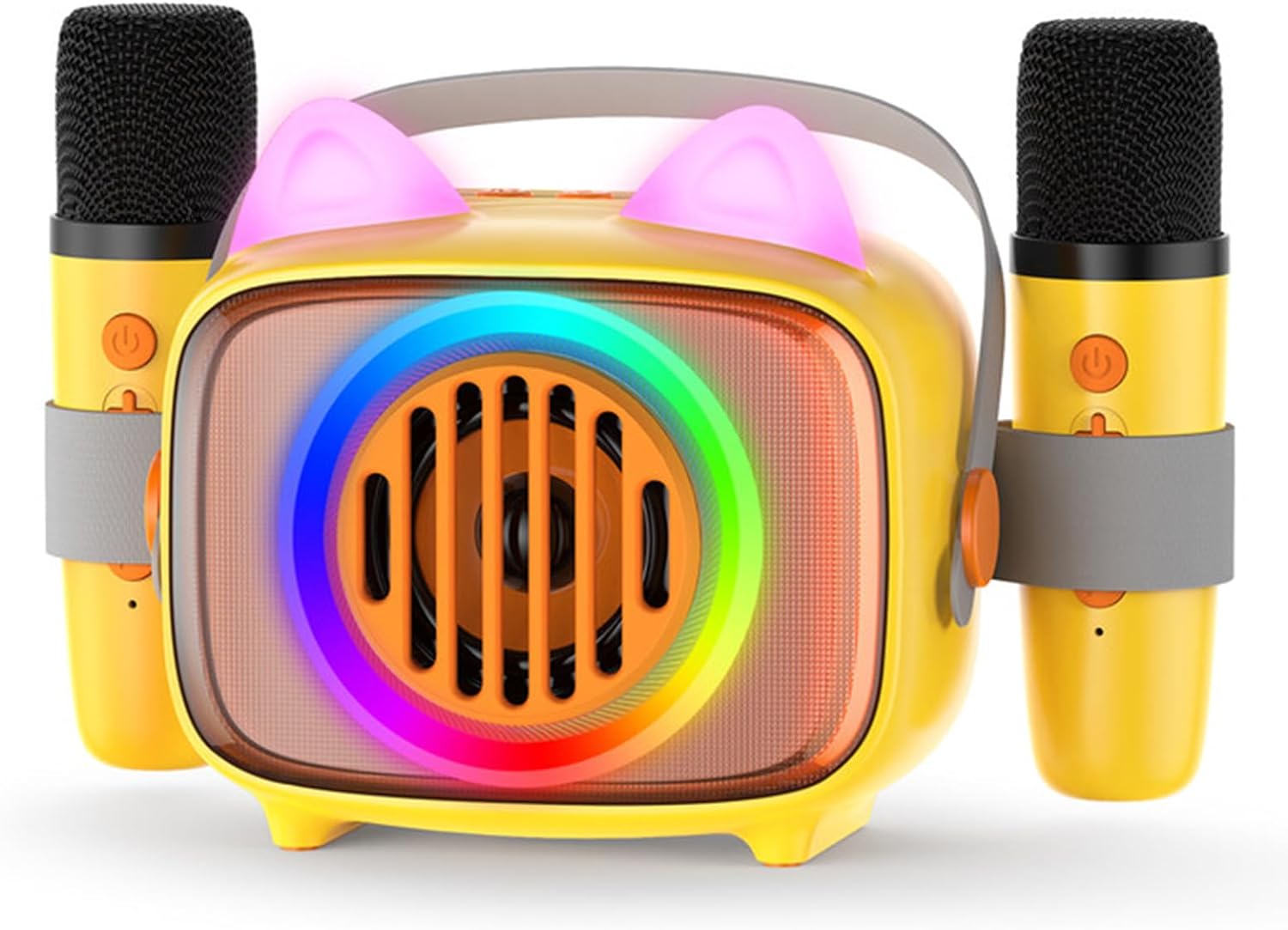 - 【Colorful Dynamic Lights】The karaoke system features 4 lighting modes and 10 lighting colors, with an independent button for easy switching. The LED lights dance to the rhythm of the music, creating a joyful atmosphere. Interesting lighting design on the cute cat ears creates a dynamic and visually engaging karaoke experience for kids, that's great for kids' parties